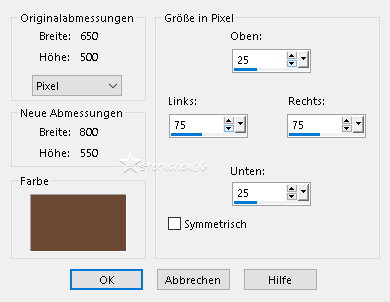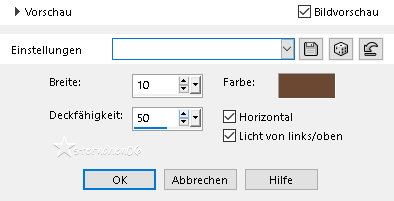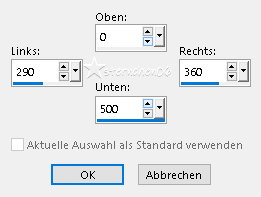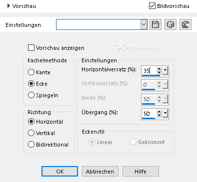 Achtung Änderungen in PSP 2020 beim Mischmodus ![]() ![]() Das Copyright des ins deutsche übersetzten Tutorials liegt bei mir sternchen06/A.Brede-Lotz Das Tutorial darf nicht kopiert, auf anderen Seiten zum Download angeboten werden Das Original Tutorial ist von Annie und du findest es hier ![]() Weitere Tutorials und Tuben findest du hier ![]() Du benötigst dein PSP 2 schöne Herbsttuben 1 Dekotube 1 misted Hintergrund 800 x 560 px Das Material aus der Kiste ![]() Entpacke das Material an einem Ort deiner Wahl Die fls Datei Öffne die Maske im PSP Plugins: Alien Skin - Eye Candy 5:Impact - Perspective Shadow MuRa's Meister - Perspective Tiling Simple - Diamonds VM Natural - Weave Distortion FARBEN aus dem Original: ![]() ![]() *1* Öffne eine neue transparente Leinwand 650 x 500 px Fülle die Leinwand mit deiner VG Farbe Auswahl - Alle auswählen Öffne deine Deko Tube - Credit entfernen Bearbeiten - Kopieren zurück zu deiner Leinwand Bearbeiten - In eine Auswahl einfügen Auswahl aufheben *2* Effekte - Bildeffekte - Nahtloses Kacheln - Standard ![]() Einstellen - Unschärfe - Gaußsche Unschärfe - Radius: 30 Ebene duplizieren Effekte - Plugins - VM Natural - Weave Distortion ![]() Effekte - Kanteneffekte - Stark nachzeichnen Mischmodus: Überzug Deckkraft: 50% *3* Ebene duplizieren Bild - Spiegeln - Horizontal spiegeln Bild - Spiegeln - Vertikal spiegeln Zusammenführen - Sichtbare zusammenfassen Aktiviere das Auswahlwerkzeug (S) Benutzerdefinierte Auswahl ![]() Auswahl - In Ebene umwandeln Auswahl aufheben Effekte - Textureffekte - Jalousie - HG Farbe ![]() Effekte - Verzerrungseffekte - Wind ![]() Effekte - Kanteneffekte - Nachzeichenen *4* Ebene duplizieren Bild - Spiegeln - Horizontal spiegeln Zusammenführen - Nach unten zusammenfassen Mischmodus: Auflösen Deckkraft: 70% Auswahl - Alle auswählen Bild - Rand hinzufügen - kein Haken bei symmetrisch - HG Farbe ![]() Effekte - Bildeffekte - Nahtloses Kacheln - OK Effekte - 3D Effekte - Schlagschatten ![]() *5* Auswahl - Alle auswählen Bild - Rand hinzufügen - kein Haken bei symmetrisch - VG Farbe ![]() Effekte - Bildeffekte - Nahtloses Kacheln - OK Auswahl umkehren Einstellen - Unschärfe - Gaußsche Unschärfe - OK Effekte - Textureffekte - Jalousie - HG Farbe - OK Effekte - Kanteneffekte - Stark nachzeichnen Auswahl umkehren Effekte - 3D Effekte - Schlagschatten - OK Auswahl aufheben *6* Effekte - Bildeffekte - Nahtloses Kacheln ![]() Öffne deine misted Tube - Credit entfernen falls vorhanden Bearbeiten - Kopieren zurück zu deiner Leinwand Bearbeiten - Als neue Ebene einfügen Objekte - Ausrichten - Rechts Mischmodus: Luminanz Deckkraft: 70% *7* Neue Rasterebene Fülle die Ebene mit der HG Farbe Ebenen - Neue Maskenebene - Aus Bild ![]() OK - Gruppe zusammenfassen Bild - Spiegeln - Horizontal spiegeln Mischmodus: Multiplikation Zusammenführen - Sichtbare zusammenfassen *8* Ebene duplizieren Effekte - Plugins - MuRa's Meister - Perspective Tiling ![]() Alternativ kannst du die Datei "punt 58" nutzen Effekte - 3D Effekte - Schlagschatten - OK Ergebnis:
