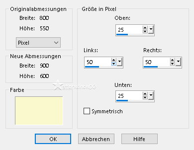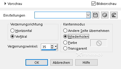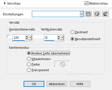 ![]() Gerne kannst du andere Farben nutzen PLUGINS: KEINE *1* Öffne eine neue transparente Leinwand 650 x 500 px fülle die Leinwand mit der VG Farbe Auswahl - Alle auswählen Aktiviere deine Haupttube - Credit entfernen Bearbeiten - Kopieren zurück zu deiner Leinwand Bearbeiten - In eine Auswahl einfügen Auswahl aufheben *2* Effekte - Bildeffekte - Nahtloses Kacheln - Standard ![]() Einstellen - Unschärfe - Strahlenförmige Unschärfe ![]() Ebene duplizieren Bild - Spiegeln - Vertikal spiegeln Mischmodus: Hartes Licht Deckkraft: 50% Ebenen - Zusammenführen - Nach unten zusammenfassen *3* Ebene duplizieren Bild - Spiegeln - Horizontal spiegeln Einstellen - Bildrauschen entfernen/hinzufügen - Bildrauschen hinzufügen ![]() Deckkraft: 50% Ebenen - Zusammenführen - Nach unten zusammenfassen Auswahl - Auswahl laden/speichern - Auswahl aus Datei.... ![]() LADEN Effekte - 3D Effekte - Schlagschatten ![]() Rechtsklick im EM - In Ebene umwandeln Auswahl aufheben *4* Effekte - Verzerrungseffekte - Delle ![]() Effekte - Geometrieeffekte - Parallelogramm ![]() Effekte - 3D Effekte - Schlagschatten - OK Ebene duplizieren Bild - Spiegeln - Horizontal spiegeln Auswahl - Alle auswählen Bild - Rand hinzufügen - kein Haken bei symmetrisch - HG Farbe ![]() Effekte - Bildeffekte - Nahtloses Kacheln - Standard Effekte - 3D Effekte - Schlagschatten - OK *5* Neue Rasterebene Fülle die Auswahl mit der HG Farbe Auswahl - Ändern - Verkleinern - 5 px drücke die Entfernen Taste Auswahl - Alle auswählen Bild - Rand hinzufügen - kein Haken bei symmetrisch - VG Farbe ![]() Effekte - Bildeffekte - Nahtloses Kacheln - Standard Auswahl umkehren Einstellen - Unschärfe - Gaußsche Unschärfe - Radius: 30 Einstellen - Bildrauschen entfernen/hinzufügen - Bildrauschen hinzufügen - OK Effekte - 3D Effekte - Schlagschatten - OK Auswahl aufheben *6* Effekte - Bildeffekte - Nahtloses Kacheln ![]() Auswahl - Auswahl laden/speichern - Auswahl aus Datei.... ![]() LADEN Rechtsklick im EM - In Ebene umwandeln Einstellen - Bildrauschen entfernen/hinzufügen - Bildrauschen hinzufügen - OK Auswahl aufheben Effekte - Bildeffekte - Nahtloses Kacheln - OK Neue Rasterebene fülle die Ebene mit der VG Farbe Ebenen - Neue Maskenebene - Aus Bild ![]() Zusammenführen - Gruppe zusammenfassen Effekte - Kanteneffekte - Stark nachzeichnen Mischmodus und Deckkraft: Unterbelichten - neu Aufhellen ![]() Ergebnis: