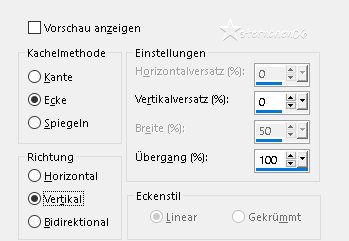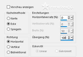![]() Gerne kannst du andere Farben nutzen Plugins: Alien Skin - Xenofex 2 - Constellation Graphics Plus - Cross Shadow MuRa's Meister - Perspective Tiling Simple - Diamonds Toadies - What You Are? und Ommadown *1* Öffne eine neue transparente Leinwand 650 x 500 px fülle die Leinwand mit der VG Farbe Effekte - Bildeffekte - Versatz - HG Farbe ![]() Effekte - Bildeffekte - Nahtloses Kacheln ![]() *2* Ebene duplizieren Bild spiegeln - Horizontal spiegeln Bild - Spiegeln - Vertikal spiegeln Mischmodus: Überzug Ebenen - Zusammenführen - Nach unten zusammenfassen Effekte - Plugins - Toadies - What You Are? ![]() Effekte - Kanteneffekte - Stark nachzeichnen Aktiviere das Auswahlwerkzeug (S) - Benutzerdefinierte Auswahl ![]() Auswahl - In Ebene umwandeln Auswahl aufheben *3* Effekte - Plugins - Toadies - Ommadown ![]() Mischmodus: Multiplikation Deckkraft: 60% Auswahl - Alles auswählen Bild - Rand hinzufügen - kein Haken bei symmetrisch - HG Farbe ![]() Effekte - Bildeffekte - Nahtloses Kacheln - OK Effekte - 3D Effekte - Schlagschatten ![]() Auswahl aufheben *4* Effekte - Bildeffekte - Nahtloses Kacheln - OK Ebene duplizieren Effekte - Plugins - Simple - Diamonds Dekkraft: 60% Ebenen - Zusammenführen - Nach unten zusammenfassen Effekte - Bildeffekte - Nahtloses Kacheln ![]() Neue Rasterebene fülle diese mit der HG Farbe Ebenen - Neue Maskenebene - Aus Bild ![]() OK - Gruppe zusammenfassen Mischmodus: Hartes Licht Deckkraft 50% *5* Auswahl - Alles auswählen Bild - Rand hinzufügen - kein Haken bei symmetrisch - VG Farbe ![]() Auswahl umkehren Effekte - Plugins - Simple - Diamonds Einstellen - Unschärfe - Bewegungsunschärfe ![]() Effekte - Kanteneffekte - Stark nachzeichnen Wiederhole den Kanteneffekt Effekte - 3D Effekte - Schlagschatten - OK Auswahl aufheben *6* Effekte - Bildeffekte - Nahtloses Kacheln - OK Neue Rasterebene fülle die Ebene mit der HG Farbe Ebenen - Neue Maskenebene - Aus Bild ![]() OK - Gruppe zusammenfassen Effekte - Plugins - Alien Skin - Xenofex 2 - Constellation ![]() Effekte - Kanteneffekte - Stark nachzeichnen Zusammenführen - Nach unten zusammenfassen Ebene duplizieren Effekte - Bildeffekte - Nahtloses Kacheln ![]() *7* Effekte - Plugins - MuRa's Meister - Perspective Tiling ![]() oder verwende "punt 55" Effekte - 3D Effekte - Schlagschatten - OK Neue Rasterebene fülle die Ebene mit der VG Farbe Ebenen - Neue Maskenebene - Aus Bild ![]() OK - Gruppe zusammenfassen Ebene duplizieren Mischmodus: Weiches Licht Zusammenführen - Nach unten zusammenfassen Bild - Spiegeln - Vertikal spiegeln Effekte - Plugins - Graphics Plus - Cross Shadow ![]() Zusammenführen - Sichtbare zusammenfassen *8* Ebene duplizieren Bild - Größe ändern - kein Haken bei Größe aller Ebenen anpassen Nach Prozentsatz - 80% Effekte - 3D Effekte - Schlagschatten - OK Aktiviere im EM die unterste Ebene Einstellen - Unschärfe - Bewegungsunschärfe - OK Bearbeiten - Kopieren Neue Rasterebene Auswahl - Auswahl laden/speichern - Auswahl aus Datei... ![]() LADEN Bearbeiten - In eine Auswahl einfügen Effekte - 3D Effekte - Schlagschatten - OK Aktiviere im EM Kopie von Zusammengefügt Auswahl - Auswahl laden/speichern - Auswahl aus Datei... ![]() LADEN Auswahl - In Ebene umwandeln Einstellen - Unschärfe - Bewegungsunschärfe - OK Auswahl aufheben *9* Bild - Spiegeln - Horizontal spiegeln Zusammenführen - Nach unten zusammenfassen Effekte - 3D Effekte - Schlagschatten - OK Öffne deine Deko - Credit entfernen falls vorhanden Bearbeiten - Kopieren zurück zu deiner Leinwand Bearbeiten - Als neue Ebene einfügen verkleinere die Dekotube - orientiere dich an meinem Bild setze sie nach links und unten - siehe mein Bild Effekte - 3D Effekte - Schlagschatten - OK Öffne deine Haupttube - Credit entfernen Bearbeiten - Kopieren zurück zu deiner Leinwand Bearbeiten - Als neue Ebene einfügen passe die Größe der Tube an - orientiere dich an meinem Bild setze die Tube nach rechts und unten Effekte - 3D Effekte - Schlagschatten - OK *10* Öffne und kopiere "tekst-iska" als neue Ebene in deine Leinwand einfügen Drücke Taste K Position X: 319 - Position Y: 410 Drücke M zum Abwählen Bild - Rand hinzufügen - symmetrisch 1 px - HG Farbe Ändere die Bildgröße auf 900 px schreibe den Credit für die Tuben und deine Signatur leserlich auf das Bild Alles zusammenfassen und als jpg/png speichern Tutorialübersetzung by sternchen06 #November 2025 |