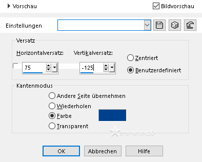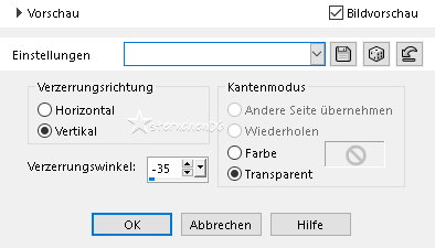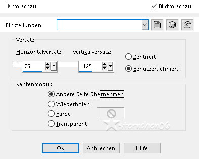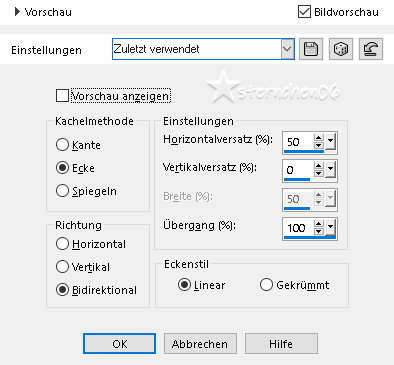 ![]() Gerne kannst du andere Farben nutzen PLUGINS: Keine *1* Öffne eine neue transparente Leinwand 650 x 500 px fülle die Leinwand mit der VG Farbe Effekte - Bildeffekte - Versatz - HG Farbe ![]() Effekte - Bildeffekte - Nahtloses Kacheln ![]() Effekte - Kanteneffekte - Nachzeichnen *2* Ebene duplizieren Effekte - Geometrieeffekte - Parallelogramm ![]() Bild - Spiegeln - Vertikal spiegeln Mischmodus: Überzug Deckkraft: 50% Ebenen - Zusammenführen - Nach unten zusammenfassen Ebene duplizieren Biild - Spiegeln - Horizontal spiegeln Mischmodus: Multiplikation Deckkraft: 50% Ebenen - Zusammenführen - Nach unten zusammenfassen Ebene duplizieren Bild - Spiegeln - Vertikal spiegeln Mischmodus: Überzug Deckkraft: 50% Ebenen - Zusammenführen - Nach unten zusammenfassen *3* Effekte - Kunstmedieneffekte - Pinselstriche - Farbe HG ![]() Effekte - Bildeffekte - Versatz ![]() Auswahl - Alle auswählen Bild - Rand hinzufügen - kein Haken bei symmetrisch - HG Farbe ![]() Effekte - Bildeffekte - Nahtloses Kacheln -OK Effekte - 3D Effekte - Schlagschatten ![]() Auswahl aufheben *4* Effekte - Bildeffekte - Nahtloses Kacheln ![]() Aktiviere das Auswahlwerkzeug (S) - Benutzerdefinierte Auswahl ![]() Effekte - 3D Effekte - Schlagschatten - OK Effekte - Geometrieeffekte - Parallelogramm ![]() Effekte - 3D Effekte - Schlagschatten - OK *5* Auswahl - Alle auswählen Bild - Rand hinzufügen - kein Haken bei symmetrisch - VG Farbe ![]() Effekte - Bildeffekte - Nahtloses Kacheln - OK Auswahl umkehren Einstellen - Unschärfe - Gaußsche Unschärfe - Radius: 10 Effekte - 3D Effekte - Schlagschatten - OK Auswahl aufheben *6* Effekte - Bildeffekte - Nahtloses Kacheln ![]() Ebene duplizieren Bild - Spiegeln - Horizontal spiegeln Deckkraft: 50% Ebenen - Zusammenführen - Nach unten zusammenfassen Neue Rasterebene fülle diese mit der VG Farbe Öffne die Maske "Narah_mask_0812" deine Leinwand ist aktiv Ebenen - Neue Maskenebene - Aus Bild ![]() Ebenen - Gruppe zusammenfassen Effekte - Kanteneffekte - Stark nachzeichnen Effekte - Textureffekte - Flechten - VG Farbe und HG Farbe ![]() Effekte - 3D Effekte - Schlagschatten - OK Mischmodus: Hartes Licht Ergebnis: