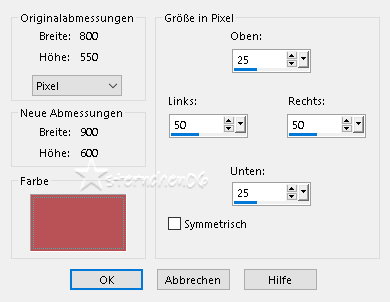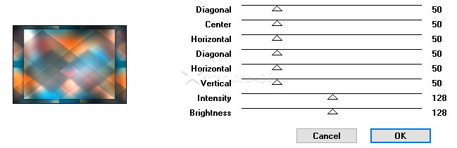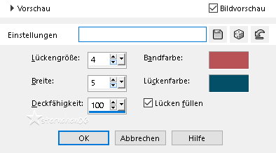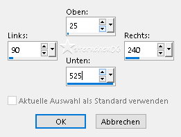 Achtung Änderungen in PSP 2020 beim Mischmodus ![]() ![]() Das Copyright des ins deutsche übersetzten Tutorials liegt bei mir sternchen06/A.Brede-Lotz Das Tutorial darf nicht kopiert, auf anderen Seiten zum Download angeboten werden Das Original Tutorial ist von Annie und du findest es hier ![]() Weitere Tutorials und Tuben findest du hier ![]() ![]() Du benötigst dein PSP 1 schöne copysafe Tube Meine ist AI generiert Das Material aus der Schatzkiste ![]() Entpacke das Material an einem Ort deiner Wahl Die Sel Dateien verknüpfe mit deinem PSP Öffne die Masken und deine Tube und Text im PSP (Optional) Dies sind die Original Farben ![]() VG/HG ![]() Gerne kannst du andere Farben nutzen PLUGINS: Graphics Plus Toadies ![]() *1* Öffne eine neue transparente Leinwand 650 x 500 px fülle die Leinwand mit der HG Farbe Auswahl - Alle auswählen Aktiviere deine Haupttube - Credit entfernen Bearbeiten - Kopieren zurück zu deiner Leinwand Bearbeiten - In eine Auswahl einfügen Auswahl aufheben *2* Effekte - Bildeffekte - Nahtloses Kacheln - Standard ![]() Einstellen - Unschärfe - Gaußsche Unschärfe - Radius: 40 Auswahl - Auswahl laden/speichern - Auswahl aus Datei... ![]() LADEN Auswahl - In Ebene umwandeln Auswahl aufheben *3* Effekte - Plugins - Graphics Plus - Horizontal Mirror ![]() Wenn du den Effekt über den FU2 anwendest, erhälst du eine Abweichung - dies kann später geändert werden ![]() Mischmodus: Aufhellen (alt Unterbelichten) Effekte - Kanteneffekte - Stark nachzeichnen *4* Ebene duplizieren Effekte - Plugins - Graphics Plus - Horizontal Mirror - OK - im FU 180/100 Bild - Spiegeln - Vertikal spiegeln Ebenen - zusammenführen - Sichtbare zusammenfassen Auswahl - Auswahl laden/speichern - Auswahl aus Datei... ![]() LADEN Auswahl - In Ebene umwandeln Effekte - Textureffekte - Flechten ![]() Auswahl aufheben *5* Effekte - Plugins - Graphics Plus - Horizontal Mirror - OK - im FU 180/100 Effekte - Kanteneffekte - Stark nachzeichnen Effekte - 3D Effekte - Schlagschatten ![]() Auswahl - Alle auswählen Bild - Rand hinzufügen - kein Haken bei symmetrisch - HG Farbe ![]() Effekte - Bildeffekte - Nahtloses Kacheln - OK Effekte - 3D Effekte - Schlagschatten - OK Auswahl aufheben *6* Effekte - Plugins - Graphics Plus - Cross Shadow ![]() Effekte - Plugins - Graphics Plus - Horizontal Mirror - OK - im FU 180/100 Aktiviere das Auswahlwerkzeug (S) - Benutzerdefinierte Auswahl ![]() Auswahl - In Ebene umwandeln Effekte - Plugins - Graphics Plus - Horizontal Mirror - OK - im FU 180/100 Effekte - 3D Effekte - Schlagschatten - OK Auswahl - Auswahl bearbeiten (rot) Bild - Spiegeln - Horizontal spiegeln Auswahl - Auswahl bearbeiten Aktiviere im EM die unterste Ebene Auswahl - In Ebene umwandeln Bild - Spiegeln - Vertikal spiegeln Auswahl aufheben *7* Effekte - Plugins - Graphics Plus - Horizontal Mirror - OK - im FU 180/100 Effekte - 3D Effekte - Schlagschatten - OK Auswahl - Alle auswählen Bild - Rand hinzufügen - kein Haken bei symmetrisch - VG Farbe ![]() Effekte - Bildeffekte - Nahtloses Kacheln - OK Auswahl umkehren Einstellen - Unschärfe - Gaußsche Unschärfe - Radius: 40 Effekte - Plugins - Graphics Plus - Horizontal Mirror - OK - im FU 180/100 Effekte - 3D Effekte - Schlagschatten - OK Auswahl aufheben *8* Effekte - Plugins - Graphics Plus - Horizontal Mirror ![]() Ergebnis: