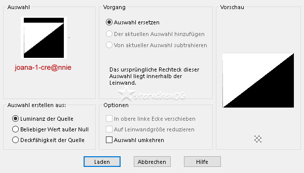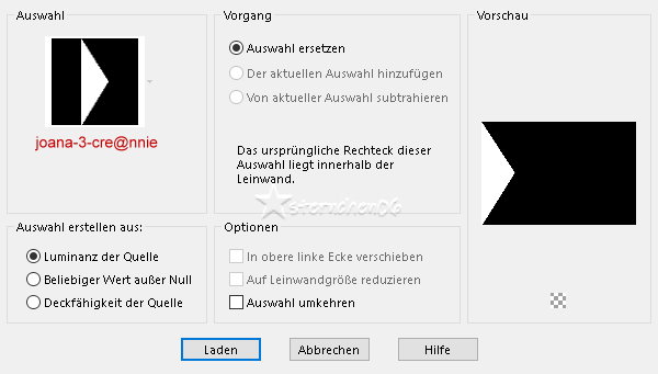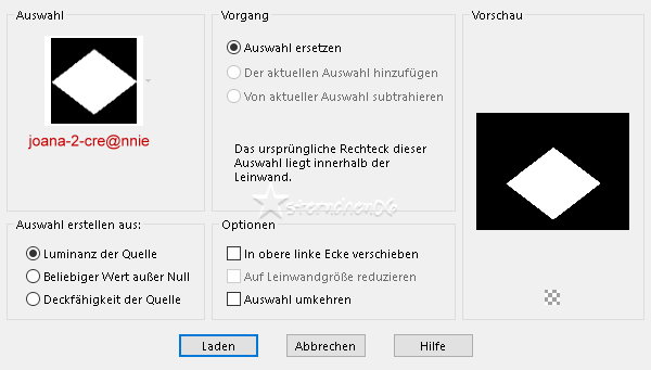 ![]() Auswahl - Auswahl laden/speichern - Auswahl aus Datei... ![]() LADEN Auswahl - In Ebene umwandeln Auswahl aufheben *9* Effekte - Plugins - Toadies - Weaver ![]() Effekte - Kanteneffekte - Nachzeichnen Effekte - 3D Effekte - Schlagschatten - OK Ebene duplizieren Bild - Spiegeln - Horizontal und Vertikal spiegeln Setze die VG Farbe auf Farbe 3 Neue Rasterebene fülle diese mit der neuen VG Farbe Ebenen - Neue Maskenebene - Aus Bild ![]() OK - Gruppe zusammenfassen Mischmodus: Überzug *10* Setze die VG Farbe auf Farbe 4 Neue Rasterebene fülle diese mit der neuen VG Farbe Ebenen - Neue Maskenebene - Aus Bild ![]() OK - Gruppe zusammenfassen Effekte - Kanteneffekte - Stark nachzeichnen Mischmodus: Überzug Zusammenführen - Sichtbare zusammenfassen Wenn du den Graphics Plus - Horizontal Mirror unter Punkt 3 aus dem FU angewendet hast: Neue Rasterebene - Füllen mit der HG Farbe - Mischmodus: Überzug *11* Öffne deine Haupttube - Credit entfernen Bearbeiten - Kopieren Als neue Ebene in deine Leinwand einfügen passe die Größe der Tube an - orientiere dich an meinem fertigen Bild Tube evtl. spiegeln Drücke Taste K Position X: 7 - Position Y: 4 M zum Abwählen drücken oder verschiebe die Tube von Hand nach links unten Ebene duplizieren Einstellen - Unschärfe - Gaußsche Unschärfe - Radius: 40 Ebenen - Anordnen - Nach unten verschieben Mischmodus: Abdunkeln (alt Überbelichten) *12* Setze die VG Farbe auf Farbe 3 Neue Rasterebene fülle diese mit der neuen VG Farbe Ebenen - Neue Maskenebene - Aus Bild ![]() Ok - Gruppe zusammenfassen Bild - Spiegeln - horizontal spiegeln Effekte - Kanteneffekte - Stark nachzeichnen Öffne und kopiere "tekst-joana" als neue Ebene in deine Leinwand einfügen Drücke Taste K Position X: 512 - Position Y: 328 M zum Abwählen drücken Effekte - 3D Effekte - Schlagschatten 3 - 3 - 75 - 0 - schwarz Auswahl - Alle auswählen Bild - Rand hinzufügen - symmetrisch 25 px - HG Farbe Effekte - 3D Effekte - Schlagschatten 0 - 0 - 75 - 35 - schwarz Auswahl aufheben Bild - Rand hinzufügen - symmetrisch 1 px - HG Farbe Ändere die Bildgröße für mich auf 900 px schreibe den Credit für die Tube und deine Signatur gut leserlich auf das Bild alles zusammenfassen und als jpg/png speichern ![]() Tutorialübersetzung by sternchen06 #Dezember 2025 |