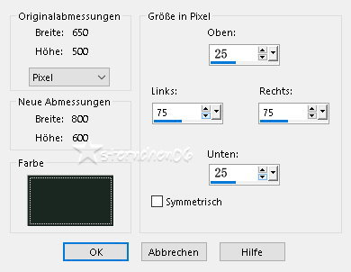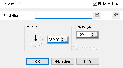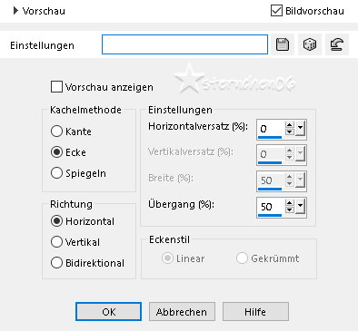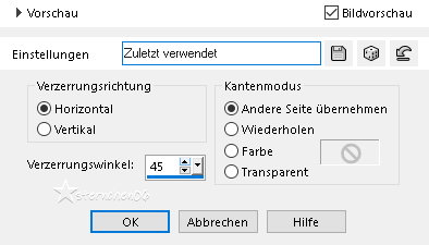 ![]() Gerne kannst du andere Farben nutzen PLUGINS: Keine *1* Öffne eine neue transparente Leinwand 650 x 500 px fülle die Leinwand mit der VG Farbe Auswahl - Alle auswählen Aktiviere deine Haupttube - Credit entfernen Bearbeiten - Kopieren zurück zu deiner Leinwand Bearbeiten - In eine Auswahl einfügen Auswahl aufheben *2* Effekte - Bildeffekte - Nahtloses Kacheln - Standard ![]() Einstellen - Unschärfe - Gaußsche Unschärfe - Radius: 50 Einstellen - Bildrauschen entfernen/hinzufügen - Bildrauschen hinzufügen ![]() *3* Aktiviere das Auswahlwerkzeug (S) - Benutzerdefinierte Auswahl ![]() Auswahl - In Ebene umwandeln Auswahl aufheben Einstellen - Unschärfe - Bewegungsunschärfe ![]() Effekte - Kanteneffekte - Stark nachzeichnen *4* Ebene duplizieren Bild - Spiegeln - Horizontal und Vertikal spiegeln Ebenen - Zusammenführen - Nach unten zusammenfassen Effekte - Geometrieeffekte - Parallelogramm ![]() Effekte - 3D Effekte - Schlagschatten ![]() Effekte - Geometrieeffekte - Parallelogramm - OK *5* Ebene duplizieren Bild - Spiegeln - Horizontal spiegeln Mischmodus: Weiches Licht Auswahl - Alle auswählen Bild - Rand hinzufügen - kein Haken bei symmetrisch - HG Farbe ![]() Effekte - Bildeffekte - Nahtloses Kacheln - OK Auswahl umkehren Einstellen - Unschärfe - Gaußsche Unschärfe - OK Einstellen - Bildrauschen entfernen/hinzufügen - Bildrauschen hinzufügen - OK Effekte - 3D Effekte - Schlagschatten - OK Auswahl aufheben Effekte - Bildeffekte - Nahtloses Kacheln - OK *6* Auswahl - Alle auswählen Bild - Rand hinzufügen - kein Haken bei symmetrisch - VG Farbe ![]() Effekte - Bildeffekte - Nahtloses Kacheln - OK Auswahl umkehren Einstellen - Unschärfe - Gaußsche Unschärfe - OK Einstellen - Bildrauschen entfernen/hinzufügen - Bildrauschen hinzufügen - OK Effekte - 3D Effekte - Schlagschatten - OK Auswahl aufheben Effekte - Bildeffekte - Nahtloses Kacheln - Bildrichtung: Horizontal ![]() *7* Neue Rasterebene fülle diese mit der VG Farbe Ebenen - Neue Maskenebene - Aus Bild ![]() OK - Gruppe zusammenfassen Mischmodus: Überzug Effekte - Kanteneffekte - Stark nachzeichnen Ebenen - Zusammenführen - Nach unten zusammenfassen Neue Rasterebene fülle diese mit der VG Farbe Ebenen - Neue Maskenebene - Aus Bild ![]() OK - Gruppe zusammenfassen Bild - Spiegeln - Horizontal spiegeln Mischmodus: Aufhellen ( ehemals Unterbelichten) Deckkraft: 60% Effekte - Kanteneffekte - Stark nachzeichnen Ergebnis:
