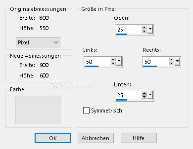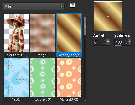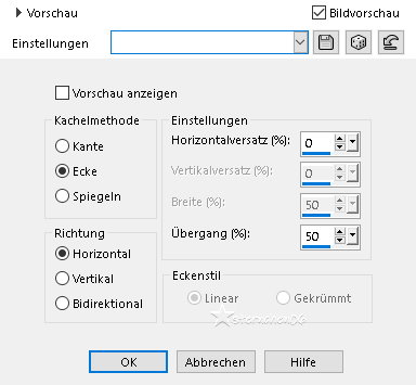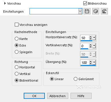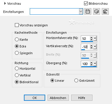 Achtung Änderungen in PSP 2020 beim Mischmodus ![]() ![]() Das Copyright des ins deutsche übersetzten Tutorials liegt bei mir sternchen06/A.Brede-Lotz Das Tutorial darf nicht kopiert, auf anderen Seiten zum Download angeboten werden Das Original Tutorial ist von Annie und du findest es hier ![]() Weitere Tutorials und Tuben findest du hier ![]() Du benötigst dein PSP 1 Haupttube meine ist AI generiert Das Material aus der Kiste ![]() Entpacke das Material an einem Ort deiner Wahl Die Sel Datei verknüpfe mit deinem PSP FARBEN: Original ![]() ![]() *1* Öffne eine neue transparente Leinwand 650 x 500 px Fülle die Leinwand mit deiner VG Farbe *2* Auswahl - Alle auswählen Öffne deine Haupttube - Credit entfernen Bearbeiten - Kopieren zurück zu deiner Leinwand Bearbeiten - In eine Auswahl einfügen Auswahl aufheben *3* Effekte - Bildeffekte - Nahtloses Kacheln - Standard ![]() Einstellen - Unschärfe - Gaußsche Unschärfe - Radius: 50 *4* Öffne "koper_randje" - minimieren In der Materialfarbpalette klicke auf die VG Farbe und dann auf Muster Suche "koper_randje" mit den Einstellungen - OK ![]() Neue Rasterebene Auswahl - Alle auswählen Auswahl - Ändern - Verkleinern - 25 px fülle die Auswahl mit dem Muster Auswahl - Ändern - Verkleinern - 5 px Bearbeiten - Löschen Auswahl - Ändern - Verkleinern - 10 px Fülle die Auswahl mit der HG Farbe Auswahl - Ändern - Verkleinern - 5 px Bearbeiten - Löschen Auswahl - Ändern - Verkleinern - 10 px fülle die Auswahl mit dem Muster Auswahl - Ändern - Verkleinern - 5 px Bearbeiten - Löschen Auswahl aufheben *5* Effekte - Bildeffekte - Nahtloses Kacheln ![]() Ebene duplizieren Bild - Spiegeln - Horizontal spiegeln Zusammenführen - Sichtbare zusammenfassen Effekte - Bildeffekte - Nahtloses Kacheln ![]() *6* Auswahl - Alle auswählen Bild - Rand hinzufügen - kein Haken bei symmetrisch - HG Farbe ![]() Effekte - 3D Effekte - Schlagschatten ![]() Auswahl aufheben *7* Effekte - Bildeffekte - Nahtloses Kacheln - OK Ebene duplizieren Bild - Spiegeln - Horizontal spiegeln Mischmodus - Weiches Licht Zusammenführen - Nach unten zusammenfassen Effekte - Verzerrungseffekte - Wind ![]() Neue Rasterebene setze die HG Farbe auf schwarz Fülle die Ebene mit der HG Farbe Öffne die Maske "NarahsMasks_1572" deine Leinwand ist aktiv Ebenen - Neue Maskenebene - Aus Bild ![]() OK - Gruppe zusammenfassen *8* Auswahl - Alle auswählen Bild - Rand hinzufügen - kein Haken bei symmetrisch - VG Farbe ![]() Auswahl umkehren Fülle die Auswahl mit dem Muster Effekte - 3D Effekte - Schlagschatten - OK Auswahl - In Ebene umwandeln Auswahl aufheben Bild - Spiegeln - Horizontal spiegeln Mischmodus: Auflösen Deckkraft: 50% Zusammenführen - Nach unten zusammenfassen Effekte - Bildeffekte - Nahtloses Kacheln ![]() Ergebnis bis hier: