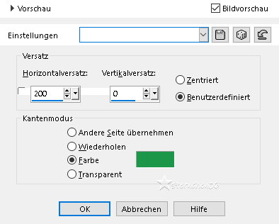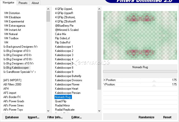 und ein Rotton ![]() Plugins: Grün geschriebene Effekte sind im FU2 zu finden &<Bkg Kaleidoscope> - Nomads Rug Alien Skin - Eye Candy 5:Impact MuRa's Meister Toadies *1* Öffne eine neue transparente Leinwand 650 x 500 px fülle die Leinwand mit der VG Farbe Effekte - Bildeffekte - Versatz - HG Farbe ![]() Effekte - Bildeffekte - Nahtloses Kacheln ![]() *2* Ebene duplizieren Bild - Spiegeln - Horizontal spiegeln Mischmodus - Hartes Licht Deckkraft: 50% Nach unten zusammenfassen *3* Ebene duplizieren Effekte - Plugins - Toadies - Weaver ![]() Effekte - Geometrieeffekte - Parallelogramm ![]() Mischmodus: Auflösen Deckkraft: 50% Nach unten zusammenfassen *4* Ebene duplizieren Bild - Spiegeln - Horizontal spiegeln Mischmodus: Multiplikation Deckkraft: 50% *5* Auswahl - Alle auswählen Bild - Rand hinzufügen - kein Haken bei symmetrisch - HG Farbe ![]() Effekte - Bildeffekte - Nahtloses Kacheln - OK Effekte - 3D Effekte - Schlagschatten ![]() Auswahl aufheben Effekte - Bildeffekte - Nahtloses Kacheln - Bildrichtung: Horizontal *6* Stelle die VG Farbe auf einen Rotton z.B. ![]() Neue Rasterebene Auswahl - Auswahl laden/speichern - Auswahl aus Datei.... ![]() LADEN Fülle die Auswahl mit der VG Farbe Auswahl - Ändern - Verkleinern - 25 px Bearbeiten - Löschen Auswahl aufheben *7* Effekte - Plugins - Toadies - Weaver ![]() Effekte - Kanteneffekte - Stark nachzeichnen Ebene duplizieren Bild - Spiegeln - Horizontal spiegeln Auswahl - Alle auswählen Bild - Rand hinzufügen - kein Haken bei symmetrisch - VG Farbe ![]() Auswahl umkehren Effekte - Plugins - Toadies - What You Are? ![]() Effekte - Kanteneffekte - Stark nachzeichnen Auswahl umkehren Effekte - 3D Effekte - Schlagschatten - OK Auswahl aufheben *8* Effekte - Bildeffekte - Nahtloses Kacheln - Bildrichtung: Horizontal - OK Ebene duplizieren Effekte - Plugins - I.C.Net Software - FU2 - &<Bkg Kaleidoscope> - Nomads Rug ![]() Mischmodus: Multiplikation *9* Neue Rasterebene fülle diese mit der VG Farbe Ebenen - Neue Maskenebene - Aus Bild ![]() OK - Gruppe zusammenfassen Effekte - Kanteneffekte - Stark nachzeichnen Mischmodus: Multiplikation Ergebnis: