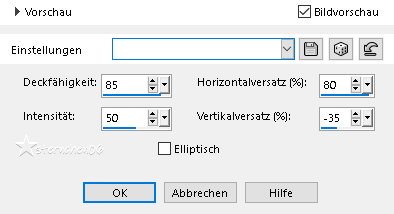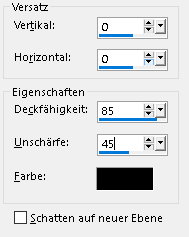 ![]() Aktiviere im EM die oberste Ebene Raster 3 ~13~ Effekte - Plugins - Alien Skin - Eye Canty 5:Impact - Perspective Shadow ![]() Aktiviere im EM Kopie von Raster 3 und wiederhole den Perspective Shadow ~14~ Einstellen - Farbton und Sättigung - Resonanz: 32 (Optional) Ebenen - Zusammenführen - Sichtbare zusammenfassen ~15~ Bild - Rand hinzufügen - Symmetrisch 1 px - HG Farbe Bearbeiten - Kopieren Auswahl - Alle auswählen ~16~ Bild - Rand hinzufügen - symmetrisch 50 px - Farbe egal (ich habe weiß gewählt) Auswahl umkehren ~17~ Bearbeiten - In eine Auswahl einfügen Einstellen - Unschärfe - Gaußsche Unschärfe - Radius: 25 ~18~ Effekte - Plugins - penta.com - jeans ![]() Effekte - 3D Effekte - Schlagschatten ![]() ~19~ Auswahl - Alle auswählen Auswahl - Ändern - Verkleinern - 25 px Effekte - 3D Effekte - Schlagschatten - OK Auswahl aufheben ~20~ Öffne und kopiere "EF-Fragmentos_Texto" als neue Ebene in deine Leinwand einfügen Positioniere den Text nach Wunsch oder wie auf meinem fertigen Bild zu sehen Alles zusammenfassen und die Bildgröße auf 900 px ändern Schreibe den Credit für die Tube und deine Signatur leserlich auf das Bild Alles zusammenfassen und als jpg/png speichern Tutorialübersetzung by sternchen06 #November 2025 |