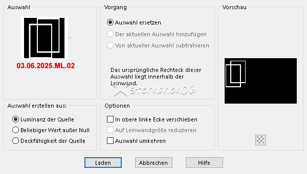 Achtung Änderungen in PSP 2020 beim Mischmodus ![]() ![]() Das Copyright des ins deutsche PSP übersetzten Tutorials liegt bei mir sternchen06/A.Brede-Lotz Das Tutorial darf nicht kopiert oder auf anderen Seiten zum Download angeboten werden. Das Original Tutorial ist von Mamiely (Lylia)du findest es hier ![]() ![]() Bilder zu den Tutorials und Tuben findest du hier ![]() Du benötigst dein PSP 1 Haupttube Das Material aus der Kiste ![]() Entpacke das Material an einen Ort deiner Wahl Die Sel Dateien verknüpfe mit deinem PSP PLUGINS: I.C.Net Software - FU2 Andrew Filters 29 - A Couple of Copies Funhouse - Heizenberg's Mirror It@lian Editors Effekt - Raggi di Luce AAA Filters - Costum - Landscape L en K landksiteofwonders - Paris und Palmyre FARBEN: Original: ![]() Meine Farben: ![]() VG/HG ![]() Farbverlauf - Linear ![]() ![]() *1* Öffne eine neue transparente Leinwand 950 x 600 px Fülle die Leinwand mit dem Farbverlauf *2* Neue Rasterebene Erstelle aus Farbe 3 und 4 folgenden linearen Farbverlauf ![]() Effekte - Plugins - I.C.Net Software - Andrew Filters 29 - A Couple Of Copies, Please ![]() Einstellen - Schärfe - Scharfzeichnen Zusammenführen - Alle zusammenfassen *3* Ebene duplizieren Effekte - Plugins - I.C.Net Software - Funhouse - Heizenberg's Mirror ![]() *4* Öffne und kopiere "Déco-ML-01" Als neue Ebene in deine Leinwand einfügen Mischmodus: Luminanz (Vorversion) Deckkraft: 95% Aktiviere im EM die unterste Ebene Auswahl - Auswahl laden/speichern - Auswahl aus Datei... ![]() LADEN Mischmodus: Weiches Licht Auswahl - In Ebene umwandeln Ebenen - Anordnen - An 1. Stelle verschieben Effekte - Textureffekte - Feines Leder ![]() *5* Öffne deine Haupttube - Credit entfernen evtl. spiegeln - orientiere dich an meinem fertigen Bild Bearbeiten - Kopieren zurück zu deiner Leinwand Bearbeiten - In eine Auswahl einfügen Auswahl aufheben Neue Rasterebene Auswahl - Auswahl laden/speichern - Auswahl aus Datei... ![]() LADEN Fülle die Auswahl mit weiß Ebenen - Anordnen - Nach unten verschieben Effekte - Textureffekte - Flechten - Bandfarbe: weiß - Lückenfarbe - Farbe 1 ![]() Auswahl aufheben Effekte - 3D Effekte - Schlagschatten ![]() *6* Wiederhole den Schatten auf der obersten Ebene (der Frauentube) Zusammenführen - Nach unten zusammenfassen Aktiviere im EM die unterste Ebene Auswahl - Auswahl laden/speichern - Auswahl aus Datei... ![]() LADEN Auswahl - In Ebene umwandeln Ebenen - Anordnen - An 1. Stelle verschieben Effekte - Textureffekte - Feines Leder ![]() Öffne erneut deine Haupttube - Credit entfernen evtl. spiegeln - siehe mein fertiges Bild Bearbeiten - Kopieren zurück zu deiner Leinwand Bearbeiten - In eine Auswahl einfügen Auswahl aufheben *7* Neue Rasterebene Auswahl - Auswahl laden/speichern - Auswahl aus Datei... ![]() LADEN Fülle die Auswahl mit weiß Ebenen - Anordnen - Nach unten verschieben Effekte - Textureffekte - Flechten - Bandfarbe: weiß - Lückenfarbe - Farbe 1 - OK Effekte - 3D Effekte - Schlagschatten - OK Auswahl aufheben Wiederhole den Schatten auf der obersten Ebene (der Frauentube) Zusammenführen - Nach unten zusammenfassen Öffne erneut deine Haupttube - Credit entfernen Bearbeiten - Kopieren Als neue Ebene in deine Leinwand einfügen Platzierung ähnlich meines fertigen Bildes Effekte - 3D Effekte - Schlagschatten - OK *8* Öffne und kopiere "Déco-ML-02" Als neue Ebene in deine Leinwand einfügen - bei Bedarf einfärben Öffne und kopiere "Texte Super Nana" Als neue Ebene in deine Leinwand einfügen - bei Bedarf einfärben Platziere den Text links unten - siehe mein fertiges Bild Öffne und kopiere "Déco-ML-03" Als neue Ebene in deine Leinwand einfügen Zusammenführen - Alle zusammenfassen Auswahl - Alle auswählen Bild - Rand hinzufügen - symmetrisch 5 px - Farbe 1 Neue Rasterebene Effekte - 3D Effekte - Aussparung ![]() *9* Auswahl - Alle auswählen Bild - Rand hinzufügen - symmetrisch 50 px - weiß Auswahl umkehren Fülle den Rand mit diesem linearen Farbverlauf - Farbe 1 u. 2 ![]() Effekte - Plugins - L en K landksiteofwonders - Paris ![]() *10* Auswahl - Alle auswählen Bild - Rand hinzufügen - symmetrisch 40 px - weiß Auswahl umkehren Fülle den Rand mit diesem linearen Farbverlauf - Umkehren angehakt (Farbe 2 u. 1) Effekte - Plugins - I.C.Net Software - FU2 - It@lian Editors Effekt - Raggi di Luce ![]() Auswahl aufheben *11* Auswahl - Auswahl laden/speichern - Auswahl aus Datei... ![]() LADEN Neue Rasterebene Fülle die Auswahlen mit Farbe 2 Effekte - Plugins - L en K landksiteofwonders - Palmyre ![]() Auswahl umkehren Effekte - 3D Effekte - Schlagschatten ![]() Auswahl aufheben *12* Öffne und kopiere "Coin-Dentelle-ML" Als neue Ebene in deine Leinwand einfügen Zusammenführen - Alle zusammenfassen Auswahl - Alle auswählen Bild - Rand hinzufügen - symmetrisch 5 px - Farbe 2 Neue Rasterebene Effekte - 3D Effekte - Aussparung ![]() Auswahl aufheben *13* Ändere die Bildgröße für mich auf 900 px Effekte - Plugins - AAA Filters - Custom - Landscape ![]() *14* Schreibe nun den Credit für die Tube und deine Signatur auf das Bild Alles zusammenfassen und als jpg/png speichern ![]() Tutorialübersetzung by sternchen06 #Juni 2025 |