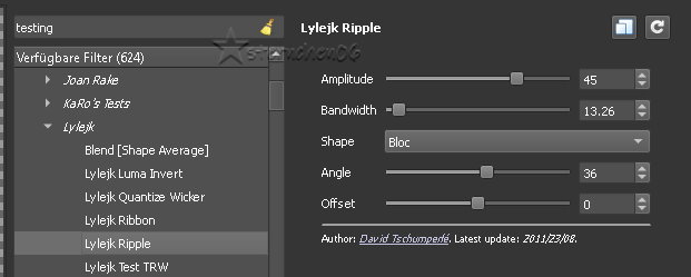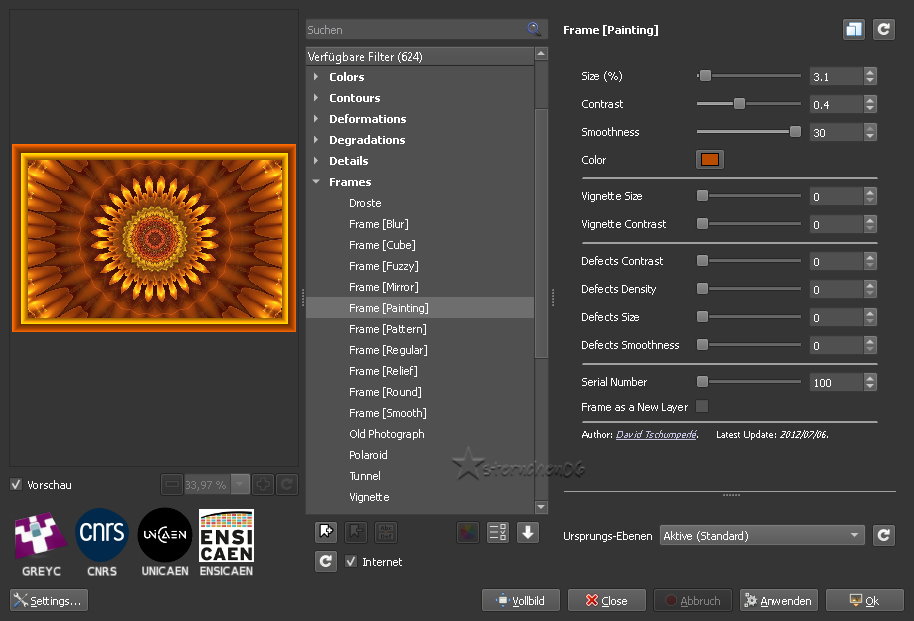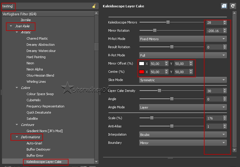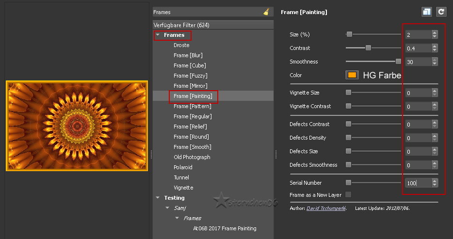 Achtung Änderungen in PSP 2020 beim Mischmodus ![]() ![]() Das Copyright des ins deutsche PSP übersetzten Tutorials liegt bei mir sternchen06/A.Brede-Lotz Das Tutorial darf nicht kopiert oder auf anderen Seiten zum Download angeboten werden. Köszönjük Margaret, hogy megengedted nekünk, hogy németre fordítsuk az oktatóanyagodat.Das Original findest du hier - klick auf das Banner ![]() ![]() Weitere Tutorials und Tuben findest du auf unserer Seite ![]() Du benötigst dein PSP 1 Haupttube 1 misted Bild (432x432px) das Material aus der Kiste ![]() Entpacke das Material an einem Ort deiner Wahl PLUGINS: Gmic - G'Mic - QT... --> Alien Skin - Eye Candy 5:Impact - Glass & Perspective Shadow FARBEN die ich verwendet habe: VG oben - HG unten ![]() Suche dir 2 Farben aus deiner Tube Du kannst das HG Bild aus dem Material passend einfärben ![]() *1* Öffne "Alap" in deinem PSP mit den Tasten Umschalt + D erstelle eine Kopie und schließe das Original Bei Bedarf färbe den HG passend zu deinen Farben ein *2* Effekte - Plugins - Gmic - G'Mic - QT Gebe oben Testing ein - Joan Rake - Deformations - Kaleidoskope Layer Cake um den Wert bei Mirror Rotation zu ändern klicke auf das Quadrat und dann mit den Pfeiltasten (rechts oder links) bis du auf den Wert kommst die anderen Werte kannst du direkt eingeben ![]() Ergebnis: ![]() *3* Effekte - Plugins - Gmic - G'Mic - QT Gebe oben Frames ein - Frame (Painting) - auch hier wieder mit den Pfeiltasten arbeiten um die Kommazahlen zu erreichen Nach dem OK musst du das Bild an einem Ort deiner Wahl speichern ![]() *4* Öffne das eben gespeicherte Bild Effekte - Plugins - Gmic - G'Mic - QT ![]() Nach dem OK musst du das Bild an einem Ort deiner Wahl speichern *5* Öffne das eben gespeicherte Bild Effekte - Plugins - Gmic - G'Mic - QT ![]() Speichere den Rahmen, wenn du den Haken bei Frame es a New Layer vergessen hast, nicht schlimm, er ist im Material enthalten *6* Der Rahmen ist aktiv Effekte - Plugins - Gmic - G'Mic - QT ![]() *7* Effekte - Plugins - Alien Skin - Eye Candy 5:Impact - Glass - VG Farbe ![]() *8* Aktiviere das Bild aus Punkt 4 Neue Rasterebene Auswahl - Alle auswählen Kopiere den Rahmen aus Punkt 6 zurück zu deiner Leinwand Bearbeiten - In eine Auswahl einfügen Auswahl aufheben Zusammenführen - Nach unten zusammenfassen *9* Öffne dein misted Bild - evtl. Credit entfernen Bearbeiten - Kopieren zurück zu deiner Leinwand Bearbeiten - Als neue Ebene einfügen *10* Aktiviere das Auswahlwerkzeug (S) - Kreis aktiviere die unterste Ebene und ziehe eine Auswahl wie im Screen zu sehen ![]() Auswahl in Ebene umwandeln *11* Einstellen - Unschärfe - Gaußsche Unschärfe - Radius: 20 Auswahl aufheben Aktiviere die oberste Ebene Öffne deine Haupttube - Credit entfernen Bearbeiten - Kopieren zurück zu deiner Leinwand Bearbeiten - Als neue Ebene einfügen Größe der Tube anpassen - orientiere dich an meinem Bild Verschiebe die Tube nach links unten Bei Bedarf nachschärfen *12* Effekte - Plugins - Alien Skin - Eye Candy 5:Impact - Perspective Shadow ![]() Zusammenführen - Alle zusammenfassen Effekte - Plugins - Gmic - G'Mic - QT ![]() Nach dem OK musst du das Bild an einem Ort deiner Wahl speichern Öffne das eben gespeicherte Bild Ändere die Bildgröße auf 900 px Schreibe den Credit für die Tube, BG by... und deine Signatur auf das Bild Alles zusammenfassen und als jpg/png speichern ![]() Tutorial Übersetzung by sternchen06 #Oktober 2025 |