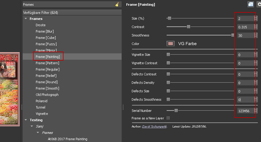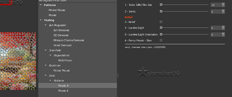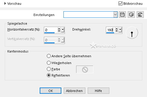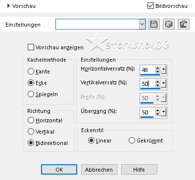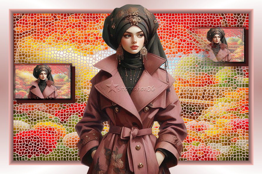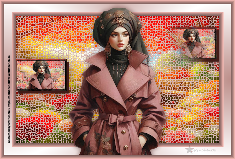 Achtung Änderungen in PSP 2020 beim Mischmodus ![]() ![]() Das Copyright des ins deutsche PSP übersetzten Tutorials liegt bei mir sternchen06/A.Brede-Lotz Das Tutorial darf nicht kopiert oder auf anderen Seiten zum Download angeboten werden. Köszönjük Margaret, hogy megengedted nekünk, hogy németre fordítsuk az oktatóanyagodat.Das Original findest du hier - klick auf das Banner ![]() ![]() Weitere Tutorials und Tuben findest du auf unserer Seite ![]() Du benötigst dein PSP 1 Haupttube 1 HG Bild 564 x 564 px meine sind AI generiert das Material aus der Kiste ![]() Entpacke das Material an einem Ort deiner Wahl PLUGINS: Gmic - G'Mic - QT... --> ![]() FM Tile Tools - Saturation Emboss AAA Frames - Foto Frame Meine Farben: ![]() und weiß Suche dir eine helle und dunkle Farbe passend zu deiner Tube ![]() *1* Öffne eine neue transparente Leinwand 800 x 500 px Fülle die Ebene mit der VG Farbe Neue Rasterebene Auswahl - Alle auswählen Öffne und Kopiere dein HG Bild zurück zu deiner Leinwand Bearbeiten - In eine Auswahl einfügen Auswahl aufheben *2* Effekte - Plugins - Gmic - G'Mic - QT... (wird im neuen Tab ![]() Testing - Samj - Mosaik A ![]() Effekte - Plugins - FM Tile Tools - Saturation Emboss ![]() Effekte - 3D Effekte - Schlagschatten - weiß ![]() *3* Öffne deine Haupttube - Credit entfernen Tube duplizieren Ziehe eine Auswahl um ca. die Hälfte der Tube Auswahl umkehren - Entfernen Taste drücken Auswahl aufheben Kopiere die halbe Tube - Die Tubenleinwand nicht schließen zurück zu deiner Leinwand Bearbeiten - Als neue Ebene einfügen passe evtl. die Größe an Die Tube sollte mittig sein und unten abschließen evtl. Nachschärfen Effekte - 3D Effekte - Schlagschatten - HG Farbe Werte wie eben *4* Bearbeiten - Inhalte kopieren - Alle Ebenen kopieren Bearbeiten - Als neue Ebene in deine Leinwand einfügen ![]() Bild - Größe ändern - kein Haken bei Größe aller Ebenen anpassen Nach Prozentsatz - 25% Aktiviere das Auswahlwerkzeug (S) - Deckend in Ebene ![]() Das kleine Bild ist ausgewählt Effekte - Plugins - AAA Frames - Foto Frame ![]() Auswahl aufheben *5* Drücke Taste K Oberes Menü ![]() Einstellen - Schärfen - Scharfzeichnen Effekte - 3D Effekte - Schlagschatten - HG Farbe ![]() Ebene duplizieren Effekte - Bildeffekte - Nahtloses Kacheln ![]() Zusammenführen - Nach unten zusammenfassen Effekte - 3D Effekte - Schlagschatten - HG Farbe Werte wie eben *6* Aktiviere im EM die Tbenebene - Rechtsklick - Löschen Zusammenführen - Alle zusammenfassen Effekte - Plugins - Gmic - G'Mic - QT... (wird im neuen Tab ![]() Frames - Frame [Painting] Die Schieberegler werden mit den Pfeiltasten verschoben, klicke dafür auf den Schieber ![]() OK Das Bild speichern *7* Öffne das eben gespeicherte Bild - das andere kannst du schließen Auswahl - Alle auswählen Bild - Rand hinzufügen - symmetrisch 30 px - VG Farbe Auswahl umkehren Erstelle aus der VG Farbe und weiß diesen Nova Farbverlauf ![]() Fülle die Auswahl mit dem Farbverlauf Effekte - Reflexionseffekte - Spiegelrotation ![]() Auswahl aufheben *8* Aktiviere deine Haupttube wieder - Auswahl aufheben fallt noch aktiv kopiere die unterste Ebene (Original Tube) zurück zu deiner Leinwand Als neue Ebene einfügen passe die Größe der Tube an - orientiere dich an meinem fertigen Bild evtl. Nachschärfen Effekte - 3D Effekte - Schlagschatten - HG Farbe Werte wie eben Zusammenführen - Alle zusammenfassen Ergebnis: ![]() *9* Effekte - Plugins - Gmic - G'Mic - QT... (wird im neuen Tab ![]() Frames - Frame [Painting] Die Schieberegler werden mit den Pfeiltasten verschoben, klicke dafür auf den Schieber ![]() OK Das Bild speichern *10* Öffne das eben gespeicherte Bild - das andere kannst du schließen Ändere die Bildgröße auf 900 px Schreibe den Credit für die Tube und deine Signatur auf das Bild Alles zusammenfassen und als jpg/png speichern ![]() Tutorialübersetzung by sternchen06 #September 2025 |