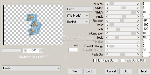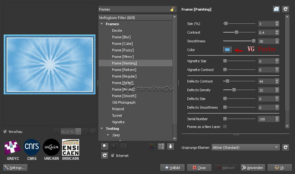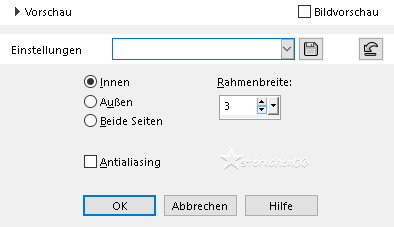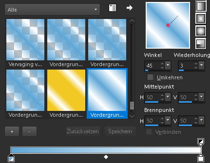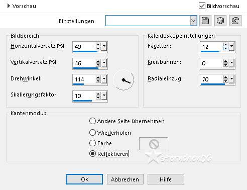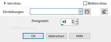 ![]() Suche dir 2 Farben aus deiner Tube erstelle folgenden linearen Farbverlauf ![]() *1* Öffne eine neue transparente Leinwand 800 x 500 px fülle diese mit dem Farbverlauf Effekte - Plugins - Mehdi - Sorting Tiles ![]() Effekte - Reflexionseffekte - Kaleidoskope ![]() *2* Effekte - Kanteneffekte - Nachzeichnen Bild - Rand hinzufügen - symmetrisch 2 px - weiß 2 px - VG Farbe 2 px - weiß Effekte - Plugins - Gmic - G'Mic - QT Gebe oben Frames ein - dann übernehme die Einstellungen den Size Wert änderst du indem du auf das Quadrat klickst und dann die Pfeiltaste rechts oder links ![]() Speichere das neue Bild *3* Öffne das eben gespeicherte Bild - das offene im PSP kannst du schließen du arbeitest mit dem neuen Bild weiter Auswahl - Alle auswählen Auswahl - Ändern - Verkleinern ![]() Auswahl umkehren Effekte - Plugins - Gmic - G'Mic - QT ![]() ![]() Auswahl umkehren Auswahl - Ändern - Auswahlrahmen auswählen ![]() *4* Neue Rasterebene fülle die Auswahl mit weiß Auswahl aufheben Öffne und kopiere "Deco.-psp10-pspimage" oder "Deco" (mittlere Ebene) als neue Ebene in deine Leinwand einfügen Effekte - Benutzerdefinierter Filter - Emboss_03 ![]() Öffne und kopiere dein misted Bild - ohne Credit als neue Ebene in deine Leinwand einfügen Ebenen - Anordnen - Nach unten verschieben *5* Aktiviere die oberste Ebene Öffne deine Haupttube - Credit entfernen Bearbeiten - Kopieren zurück zu deiner Leinwand Bearbeiten - Einfügen passe die Größe der Tube an - orientiere dich an meinem Bild Drücke Taste K ![]() M zum Abwählen drücken Nachschärfen Effekte - 3D Effekte - Schlagschatten - dunkles blau (oder eine dunkle Farbe passend zu deiner Hauptfarbe) ![]() Bild - Rand hinzufügen - symmetrisch 3 px - weiß *6* Effekte - Plugins - Gmic - G'Mic - QT Gebe oben Frames ein - dann übernehme die Einstellungen ![]() Speichere das neue Bild Öffne das eben gespeicherte Bild - das offene im PSP kannst du schließen du arbeitest mit dem neuen Bild weiter Rechtsklick im EM - Duplizieren Bild - Größe ändern - kein Haken bei Größe aller Ebenen .... Nach Prozentsatz - auf 18% verkleinern Bild - spiegeln - Horizontal spiegeln Nachschärfen (nicht Kantenschärfen wie im original Tut, das wird zu hart) Effekte - Plugins - MuRa's Meister - Copies ![]() Drücke Taste K ![]() M zum Abwählen drücken Effekte - 3D Effekte - Schlagschatten - dunkles blau (oder eine dunkle Farbe passend zu deiner Hauptfarbe) ![]() Bild - Rand hinzufügen - symmetrisch 1 px - weiß *7* Ändere die Bildgröße auf 900 px Schreibe den Credit für die Tube - BG by und deine Signatur auf das Bild alles zusammenfassen und als jpg/png speichern Tutorialübersetzung by sternchen06 #Dezember 2025 |
