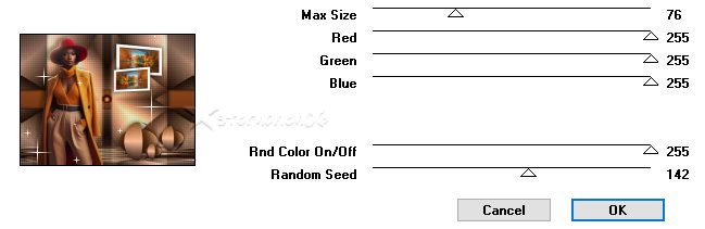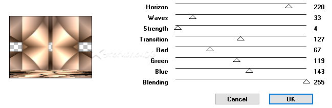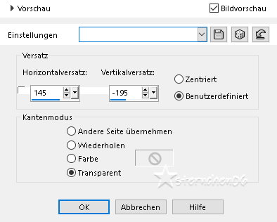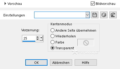 Achtung Änderungen in PSP 2020 beim Mischmodus ![]() ![]() Das Copyright des ins deutsche PSP übersetzten Tutorials liegt bei mir sternchen06 aka A.Brede-Lotz. Das Tutorial darf nicht kopiert oder auf anderen Seiten zum Download angeboten werden. Herzlichen Dank liebe Misae, dass ich deine Tutoriale ins Deutsche übersetzen darf Muchas gracias Misae por permitirme traducir sus tutoriales al alemán.![]() ![]() Weitere Tutorials und Tuben findest du hier ![]() Du benötigst: dein PSP 1 copysafe Tube deiner Wahl 1 misted Hintergrundbild PLUGIN: VM Natural FARBEN: 2 Farben aus deiner Tube + weiß das sind meine VG/HG ![]() Farbverlauf - Linear ![]() evtl. musst du bei deiner Version den Haken bei umkehren rausnehmen, achte darauf das die helle Farbe oben ist ![]() Dieser Filter hat 21 Effekte, von denen einige sehr interessant sind ![]() *1* Öffne eine neue transparente Leinwand 800 x 600 px *2* Fülle die Leinwand mit dem Farbverlauf Ebene duplizieren Effekte - Plugins - VM Natural - Weave Distortion Effekte - 3D Effekte - Schlagschatten ![]() *3* Effekte - Plugins - VM Natural - Cross Weave ![]() Effekte - Reflexionseffekte - Kaleidoskope ![]() *4* Effekte - Verzerrungseffekte - Delle (alt Bildpresse) ![]() Effekte - Bildeffekte - Nahtloses Kacheln ![]() Effekte - Reflexionseffekte - Spiegelrotation ![]() *5* Ebene duplizieren Effekte - Plugins - VM Natural - Cross Weave ![]() Mischmodus der Ebene:Multiplikation *6* Aktiviere im EM die mittlere Ebene ![]() Effekte - Plugins - VM Natural - Lakeside Reflection ![]() Zusammenführen - Sichtbare zusammenfassen *7* Neue Rasterebene Auswahlwerkzeug (S) aktivieren - Benutzerdefinierte Auswahl ![]() ![]() Neuer linearer Farbverlauf ![]() fülle die Auswahl damit Öffne deine misted Tube - evtl. Credit entfernen Bearbeiten - Kopieren zurück zu deiner Leinwand Bearbeiten - In eine Auswahl einfügen Auswahl - Ändern - Auswahlrahmen auswählen ![]() *8* Neue Rasterebene fülle die Auswahl mit weiß Auswahl aufheben Zusammenführen - Nach unten zusammenfassen Effekte - Bildeffekte - Versatz ![]() Effekte - Geometrieeffekte - Horizontalperspective ![]() Effekte - 3D Effekte - Schlagschatten - OK *9* Ebene duplizieren Bild - Größe ändern - kein Haken bei Größe aller Ebenen anpassen Nach Prozentsatz - auf 80% verkleinern Einstellen - Schärfe - Scharfzeichnen Bild - Spiegeln - Horizontal spiegeln Effekte - Bildeffekte - Versatz ![]() *10* Neue Rasterebene Klicke auf den Farbverlauf - ändere ihn wie unter Punkt 3 - aber dieses mal Umkehren (die dunkle Farbe oben) Fülle die Ebene damit Effekte - Plugins - VM Natural - Plastic Starfish ![]() Bild - Größe ändern - kein Haken bei Größe aller Ebenen anpassen Nach Prozentsatz - auf 15% verkleinern Einstellen - Schärfe - Scharfzeichnen *11* Neue Rasterebene Ändere den Farbverlauf wieder wie in Punkt 3 fülle die Ebene mit dem Farbverlauf Effekte - Plugins - VM Natural - Weave Distortion Effekte - 3D Effekte - Schlagschatten - OK Effekte - Geometrieeffekte - Kreis - Transparent *12* Bild - Größe ändern - kein Haken bei Größe aller Ebenen anpassen Nach Prozentsatz - auf 30% verkleinern Einstellen - Schärfe - Scharfzeichnen Effekte - 3D Effekte - Schlagschatten - OK Effekte - Bildeffekte - Versatz ![]() *13* Ebene duplizieren Bild - Größe ändern - kein Haken bei Größe aller Ebenen anpassen Nach Prozentsatz - auf 65% verkleinern Versetze die Kugel wie du magst Ebene duplizieren Bild - Größe ändern - kein Haken bei Größe aller Ebenen anpassen Nach Prozentsatz - auf 65% verkleinern Versetze die Kugel wie du magst *14* Öffne deine Haupttube - Credit entfernen Bearbeiten - Kopieren als neue Ebene in deine Leinwand einfügen Passe die Größe der Tube an - orientiere dich an meinem Bild setze die Tube auf die linke Seite Effekte - 3D Effekte - Schlagschatten ![]() Optional: Effekte - Plugins - VM Natural - Sparkle ![]() *15* Füge jetzt noch Rahmen nach deiner Wahl hinzu ändere das Bild am Ende auf 900 px schreibe den Credit für die Tube - BG by... und deine Signatur auf das Bild Alles zusammenfassen und als jpg/png speichern ![]() Tutorial Übersetzung by sternchen06 #Oktober 2025 |