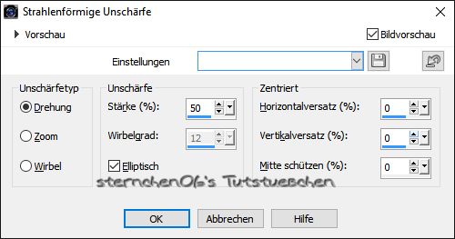 1. Öffne eine neue transparente Leinwand 950x500 px Auswahl - alles auswählen Kopiere dein Landschafts- / Blumenbild und füge es in die Auswahl ein Auswahl aufheben Suche dir noch eine helle und eine dunkle Farbe aus dem Bild 2. Einstellen - Unschärfe - strahlenförmige Unschärfe