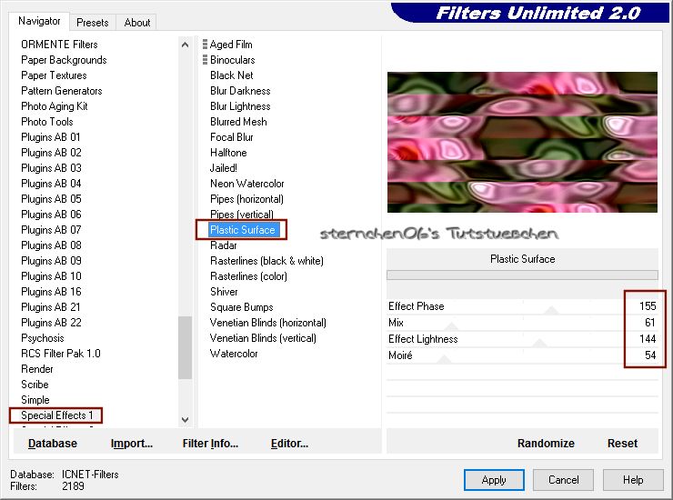 4. Effekte - Plugin - I.C.NET Software - Filter Unlimited 2.0 - Special Effects 1 - Plastic Surface falls nicht vorhanden importiere die fx Datei aus dem Material