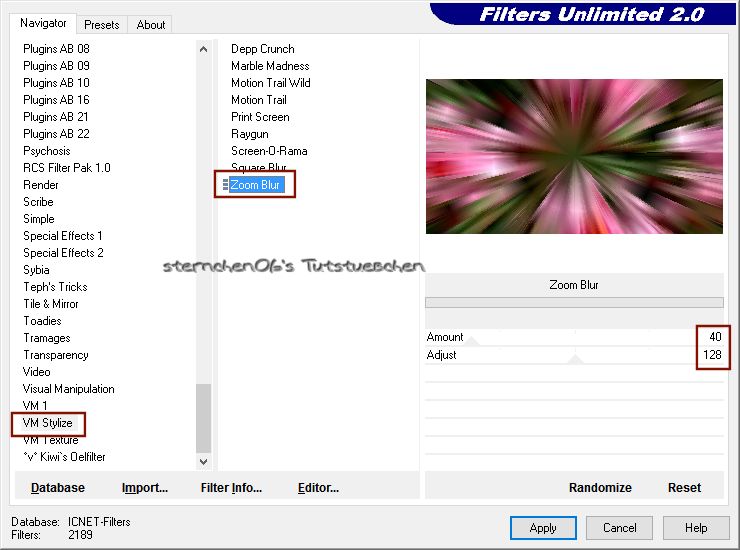 Kopiere die Leinwand - als neues Bild einfügen - wir arbeiten nun mit der Kopie 5. Effekte - Plugin - Filter VM Stylize (evtl. in den FU2 importiert) - Zoom Blur an