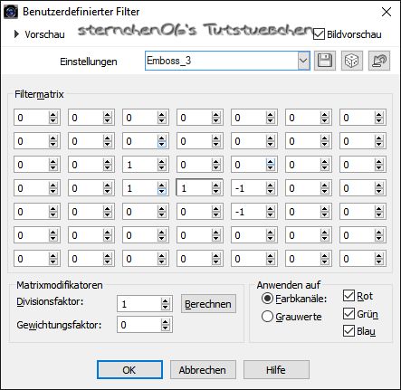 Effekte - Benutzerdefinierte Effekte - Emboss 3 Wenn du ihn noch nicht gespeichert hast übernehme die Werte vom Screen und klicke dann auf das Speichersymbol (Diskette) und speichere als Emboss3 ab, so kannst du es immer wieder nutzen