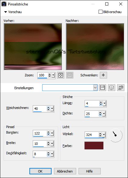 Auswahl aufheben Minimiere die Leinwand - wir benötigen sie gleich noch Aktiviere deine Original Leinwand 8. Effekte - Kunstmedieneffekte (bei älteren Versionen Maleffekte) - Pinselstriche