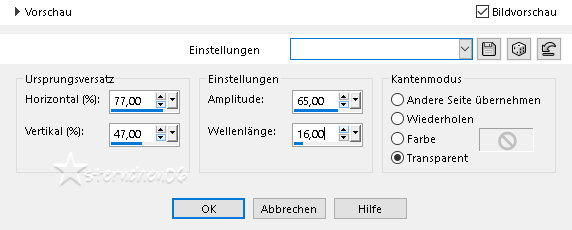 Achtung Änderungen in PSP 2020 beim Mischmodus ![]() ![]() Das Copyright des ins deutsche PSP übersetzten Tutorials liegt bei mir sternchen06/A.Brede-Lotz Das Tutorial darf nicht kopiert oder auf anderen Seiten zum Download angeboten werden. Das Original ist von PinkDank u dat ik uw tutorials in het Duits mag vertalen. Du findest es hier ![]() ![]() Weitere Tutorials und Tuben findest du hier ![]() Du benötigst: 1 Tanztube meine ist AI generiert Das Material aus der Kiste ![]() Entpacke das Material an einem Ort deiner Wahl Die Sel Dateien verknüpfe mit deinem PSP PLUGINS: Grün geschriebene Filter sind im FU 2 Simple - 4Way Averrage Nik Software - Color Efex Pro 3.0 Complete &<Bkg Kaleidoskope - 4 QFlip UpperL FARBEN: Original ![]() Nutze für dein Bild für Farbe 1 einen passenden Farbton aus deiner Tube Erstelle diesen strahlenförmigen Farbverlauf ![]() ![]() *1* Öffne eine neue transparente Leinwand 900 x 600 px fülle diese mit dem Farbverlauf *2* Ebene duplizieren Bild - Spiegeln - Horizontal spiegeln Bild - Spiegeln -Vertikal spiegeln Mischmodus: Überzug Deckkraft: 65 % Zusammenführen - Sichtbare zusammenfassen *3* Ebene duplizieren Bild - Frei drehen ![]() Ebene duplizieren Bild - Spiegeln - Horizontal spiegeln Mischmodus: Überzug Ergebnis: ![]() Zusammenführen - Sichtbare zusammenfassen *4* Neue Rasterebene Auswahl - Auswahl laden/speichern - Auswahl aus Datei.... ![]() Fülle die Auswahl mit Farbe 1 Einstellen - Bildrauschen hinzufügen/entfernen - Bildrauschen hinzufügen ![]() Auswahl halten *5* Effekte - Plugins - Simple - 4Way Averrage Auswahl aufheben Effekte - 3D Effekte - Schlagschatten ![]() *6* Effekte - Geometrieeffekte - Kreis - Transparent Effekte - 3D Effekte - Schlagschatten ![]() Ebene duplizieren Bild - Spiegeln -Vertikal spiegeln Mischmodus: Überzug Ergebnis: ![]() Zusammenführen - Sichtbare zusammenfassen *7* Öffne und kopiere "Misted tube les 121_Pink" Als neue Ebene in deine Leinwand einfügen Objekte - Ausrichten - Links Mischmodus: Luminanz (Vorversion) Zusammenführen - Sichtbare zusammenfassen *8* Effekte - Plugins - Nik Software - Color Efex Pro 3.0 Complete Vignette mit den Einstellungen vom Screen ![]() *9* Bild - Rand hinzufügen - symmetrisch 1 px - schwarz 40 px - weiß *10* Ebene duplizieren Bearbeiten - Wiederholen Ebene duplizieren Bild - Größe ändern - kein Haken bei Größe aller Ebenen anpassen Nach Prozentsatz - auf 35% verkleinern Objekte - Ausrichten - Oben Objekte - Ausrichten - Links *11* Zusammenführen - Nach unten zusammenfassen Effekte - Plugins - I.C.Net Software - FU2 - &<Bkg Kaleidoskope - 4 QFlip UpperL ![]() *12* Effekte - Bildeffekte - Nahtloses Kacheln - Standard ![]() *13* Aktiviere im EM die unterste Ebene Rechtsklick - Hintergrundebene umwandeln Ebenen - Anordnen - Nach oben verschieben Bild - Größe ändern - kein Haken bei Größe aller Ebenen anpassen Nach Prozentsatz - auf 65% verkleinern *14* Ebene duplizieren Einstellen - Unschärfe - Gaußsche Unschärfe - Radius: 30 Effekte - Verzerrungseffekte - Konzentrische Welle ![]() Mischmodus: Aufhellen Deckkraft: 55% Ebenen - Anordnen - Nach unten verschieben *15* Aktiviere im EM die oberste Ebene Effekte - 3D Effekte - Schlagschatten *16* Öffne und kopiere "Tekst decoratie les 121_Pink" als neue ebene in deine Leinwand einfügen Objekte - Ausrichten - Links *17* Öffne deine Haupttube - Credit entfernen Bearbeiten - Kopieren zurück zu deiner Leinwand Bearbeiten - Als neue Ebene in deine Leinwand einfügen evtl. spiegeln und Größe anpassen Objekte - Ausrichten - Rechts Objekte - Ausrichten Unten Effekte - 3D Effekte - Schlagschatten Mischmodus: Luminanz (Vorversion) oder wenn du es lieber magst lasse es auf Normal Zusammenführen - Sichtbare zusammenfassen *18* Effekte - Plugins - Nik Software - Color Efex Pro 3.0 Complete Old Picture - rechts: Style 1 - Color 1 oder was dir besser gefällt Option: Du kannst die Ebene auch erst duplizieren und dann den Filter anwenden - Deckkraft nach belieben ![]() Bild - Rand hinzufügen - symmetrisch 1 px - weiß *19* Ändere die Bildgröße für mich auf 900 px schreibe den Credit für die Tube und deine Signatur auf das Bild Alles zusammenfassen und als jpg speichern wenn du nicht animieren willst ANIMATION: Kopiere dein Bild Öffne den AniShop Rechtsklick auf die Fläche - Einfügen als neue Animation Dupliziere das Bild 15 mal, so das du insgesammt 16 Einzelbilder hast Markiere das 1. Bild - Bearbeiten - Alles auswählen Öffne "SimoneAni517-MNG.mng" auch dies hat 16 Einzelbilder Markiere das 1. Bild - Bearbeiten - Alles Auswählen Bearbeiten - Kopieren Aktiviere wieder deine Bilderleiste Rechtsklick ins 1.Bild - die Ani ist an die Maus gehängt gehe mit der Maus in die Mitte des Textes Rechtsklick - Bearbeiten - Einfügen - In markiertes Einzelbild - lasse die Maus los Über das Animationswiedergabesymbol ![]() bist du zufrieden speichere das ganze als GIF ab ![]() Tutorialübersetzung by sternchen06 #Oktober 2025 |
