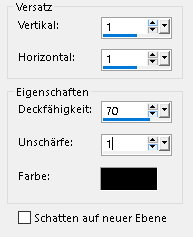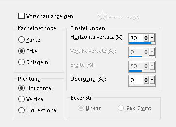 Achtung Änderungen in PSP 2020 beim Mischmodus ![]() ![]() Das Copyright des ins deutsche PSP übersetzten Tutorials liegt bei mir sternchen06/A.Brede-Lotz Das Tutorial darf nicht kopiert oder auf anderen Seiten zum Download angeboten werden. Das Original Tutorial ist von Pretty Judu findest es hier ![]() ![]() Weitere Tutorials und Tuben findest du hier ![]() ![]() Du benötigst dein PSP 1 Haupttube 1 Dekotube Das Material aus der Box ![]() Entpacke das Material an einem Ort deiner Wahl Die Sel Datei verknüpfe mit deinem PSP Grün gesschriebene Filter werden in den FU importiert I.C.Net Software - FU2 It@lien Editors Effekt - Effeto Fantasma Carolaine and Sensibility - Halloween 2 L en K LandKsiteofwonders - Djin Richard Rosenman - Tiler . Originalfarben ![]() Meine VG Farbe: ![]() Gerne kannst du andere Farben verwenden Erstelle aus 1 und 2 folgenden strahlenförmigen Farbverlauf ![]() ![]() ~1~ Öffne eine neue transparente Leinwand 900 x 600 px Fülle sie mit dem Farbverlauf Effekte - Plugins - Richard Rosenman - Tiler ![]() Effekte - Plugins - L en K LandKsiteofwonders - L en K's Djin ![]() Effekte - Kanteneffekte - Nachzeichnen ~2~ Öffne und kopiere "prettyju_la_douceur_dun_baiser_el" als neue Ebene in deine Leinwand einfügen Mischmodus: Überzug (oder was besser zu deinen Farben passt) Neue Rasterebene Auswahl - Auswahl laden/speichern - Auswahl aus Datei... ![]() LADEN Erstelle aus den Farben 3 und 4 folgenden linearen Farbverlauf ![]() fülle die Auswahlen damit Auswahl aufheben ~3~ Effekte - Bildeffekte - Nahtloses Kacheln ![]() Effekte - Kanteneffekte - Nachzeichnen Effekte - 3D Effekte - Schlagschatten ![]() Effekte - Plugins - Carolaine and Sensibility - Halloween 2 ![]() ~4~ Öffne und kopiere "prettyju_la_douceur_dun_baiser_wa" als neue Ebene in deine Leinwand einfügen bei Bedarf einfärben Drücke K ![]() Drücke M Füge einen Schlagschatten hinzu dies ist meiner ![]() ~5~ Öffne deine Dekotube (ich habe keine benutzt wegen dem Schirm) Bearbeiten - Kopieren als neue Ebene in deine Leinwand einfügen Größe der Tube anpassen platziere sie wo du magst Schlagschatten wie du magst Öffne deine Haupttube - Credit entfernen Bearbeiten - Kopieren als neue Ebene in deine Leinwand einfügen Größe der Tube anpassen platziere sie im Text Schlagschatten wie du magst ~6~ VG Farbe aus dem Bild - siehe Screen ![]() Meine ![]() Bild - Rand hinzufügen - symmetrisch 2 px - in der neuen Farbe 40 px - Farbe 3 Markiere den letzten Rand mit dem Zauberstab (Toleranz und Randschärfe 0) Effekte - Plugins - I.C.Net Software - FU2 - It@lien Editors Effekt - Effetto Fantasma ![]() Auswahl aufheben Ich habe noch einen 1 px Rand mit der neuen VG Farbe zugefügt Ändere die Bildgröße für mich auf 900 px schreibe den Credit für die Tube und deine Signatur auf das Bild Alles zusammenfassen und als jpg/png speichern ![]() Tutorialübersetzung by sternchen06 #Januar 2026 |