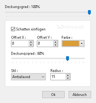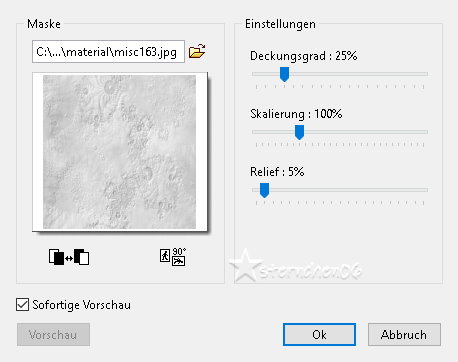 Autumn ![]() ![]() Nimm die Stecknadel mit um deinen jeweiligen Schritt zu markieren ![]() ![]() Meine Tutoriale werden hier getestet ![]() ![]() ![]() Diese Tutorialübersetzung wurde mit PFS X erstellt, kann aber mit jeder anderen PFS Version nachgearbeitet werden ![]() Das Copyright des ins PFS umgeschriebenen Tutorials liegt bei mir sternchen06 aka A.Brede-Lotz. Das Tutorial darf nicht kopiert oder auf anderen Seiten zum Download angeboten werden. Dieses Tutorial wurde im Original von Romana für PSP Du findest es hier: Vielen Dank liebe Romana das ich deine schönen Tutoriale ins PFS übersetzen darf ![]() Weitere Tutorials und Tuben findest du hier ![]() Du benötigst dein PFS 1 Haupttube 2-3 Dekotuben das Material aus der Kiste ![]() Entpacke das Material an einem Ort deiner Wahl PLUGINS: Grün geschriebene Filter sind im FU2 AFS Import - Ringtile Alien Skin - Eye Candy 5: Texture - Marble &<Bkg IV - @Night Shadow und sf10 Shades of Shadow &<Bkg Kaleidoskope - Kaleidoskope 1 Original FARBEN: ![]() ![]() Meine Farben: ![]() ![]() Suche dir 2 Farben aus deeiner Tube Außerdem benötigst du noch das Plugin Paste inside du findest es hier: https://www.photofiltre-studio.com/plugins/plugins-en.htm Scrolle bis Benjamin Founier da dann noch bis Plugin inside Klicke auf Paste into zum Downloaden Speichere die Zip "CollerDedans" an einem Ort deiner Wahl Entpacke die Datei Den Ordner "CollerDedans" Kopiere nun und speicher ihn im Plugins Ordner des PFS ![]() *1* Öffne eine neue weiße Leinwand 840x775 px Öffne "misc180_pfs" Bearbeiten - Kopieren Zurück zu deiner Leinwand Filter - Plug-In - Paste Inside Es öffnet sich dieses Fenster ![]() OK Ebene - Neu - Öffnen als Ebene - 75frame01-romana1-pfs Rechtsklick auf das Miniaturbild Manuelle Einstellungen ![]() *2* Filter - Rauschen - Rauschen hinzufügen ![]() Rechtsklick auf das Miniaturbild - Optionen ![]() *3* Ebene - Neu - Öffnen als Ebene - 75kreis01-romana1-pfs Rechtsklick auf das Miniaturbild Manuelle Einstellungen ![]() Ebene - Neu - Öffnen als Ebene - 75frame02-romana1-pfs Rechtsklick auf das Miniaturbild Manuelle Einstellungen ![]() Rechtsklick auf das Miniaturbild - Optionen ![]() *4* Ebene - Neu - Öffnen als Ebene - 75frame03-romana1-pfs Rechtsklick auf das Miniaturbild Manuelle Einstellungen ![]() Ebene - Neu - Öffnen als Ebene - 75frame04-romana1-pfs Rechtsklick auf das Miniaturbild Manuelle Einstellungen ![]() *5* Ebene - Neu - Öffnen als Ebene - 75kreis02-romana1-pfs Rechtsklick auf das Miniaturbild Manuelle Einstellungen ![]() Filter - Filter 8bf - I.C.Net Software - FU2 - &<Bkg IV - @Night Shadow ![]() Filter - Filter 8bf - I.C.Net Software - FU2 - AFS Import - Ringtile ![]() Wenn bei dir der Ringtile auch so wie oben aussieht Ebene - Neu - Öffnen als Ebene - 75kreis02a-romana1-pfs Rechtsklick auf das Miniaturbild Manuelle Einstellungen ![]() Ebene - mit vorheriger Ebene verbinden Rechtsklick auf das Miniaturbild - Optionen ![]() *6* Ebene - Neu - Öffnen als Ebene - 75kreis03-romana1-pfs Rechtsklick auf das Miniaturbild Manuelle Einstellungen ![]() Filter - Filter 8bf - I.C.Net Software - FU2 - &<Bkg IV - sf10 Shades Of Shadow ![]() Filter - Filter 8bf - I.C.Net Software - FU2 - &<Bkg Kaleidoskope - Kaleidoskope 1 ![]() *7* Ebene - Neu - Öffnen als Ebene - 75frame05-romana1-pfs Rechtsklick auf das Miniaturbild Manuelle Einstellungen ![]() Ebene - Neu - Öffnen als Ebene - 75rechteck01-romana1-pfs Rechtsklick auf das Miniaturbild Manuelle Einstellungen ![]() Ebene - Neu - Öffnen als Ebene - 75rechteck02-romana1pfs Rechtsklick auf das Miniaturbild Manuelle Einstellungen ![]() *8* Ebene - Neu - Öffnen als Ebene - 75frame06-romana1-pfs Rechtsklick auf das Miniaturbild Manuelle Einstellungen ![]() Filter - Rauschen - Rauschen hinzufügen ![]() Ebene - verbinden mit vorheriger Ebene Rechtsklick auf das Miniaturbild - Optionen ![]() *9* Ebene - Neu - Öffnen als Ebene - 75frame07-romana1-pfs Rechtsklick auf das Miniaturbild Manuelle Einstellungen ![]() Ebene duplizieren Manuelle Einstellungen ![]() *10* Ebene - Neu - Öffnen als Ebene - 75rechteck03-romana1pfs Rechtsklick auf das Miniaturbild Manuelle Einstellungen ![]() Rechtsklick auf das Miniaturbild - Optionen ![]() So sollte es aussehen: ![]() *11* Fübe nun deine Tube und Dekotuben in die Leinwand ein passe die Größen der Tuben an Die Haupttube setze nach links Rechtsklick auf das Miniaturbild - Optionen ![]() Ebene - Neu - Öffnen als Ebene - 201410181350322 setze das Wordart z.B. nach rechts oben Rechtsklick auf das Miniaturbild - Optionen Schatten deiner Wahl Ebene - Alle Ebenen verbinden *12* Bild - Rahmen außen Breite - 15 - VG Farbe Auswahl - Alles auswählen Auswahl - Breite - 15 Auswahl - Invertieren Filter - Textur - Weitere - suche dir aus dem Materialordner eine der Texturen aus ![]() Auswahl - Invertieren Filter - Muster - Verlaufender Rahmen ![]() Auswahl verstecken *13* Bild - Rahmen außen Breite - 30 - HG Farbe Auswahl - Alles auswählen Auswahl - Breite - 30 Auswahl - Invertieren Filter - Filter 8bf - Alien Skin - Eye Candy 5: Textures - Marble ![]() Filter - Filter 8bf - I.C.Net Software - FU 2 - Buttons & Frames - 3D Glass Frame (rounded) ![]() Auswahl verstecken *14* Bild - Rahmen außen Breite - 15 - VG Farbe Auswahl - Alles auswählen Auswahl - Breite - 15 Auswahl - Invertieren Filter - Textur - Weitere - suche dir aus dem Materialordner eine der Texturen aus ![]() Bild - Rahmen außen Breite - 5 - HG Farbe Auswahl - Alles auswählen Auswahl - Breite - 15 Auswahl - Invertieren Filter - Textur - Weitere - suche dir aus dem Materialordner eine der Texturen aus ![]() Auswahl verstecken *15* Ändere die Bildgröße für mich auf 900 px Schreibe den Credit für die Tube und deine Signatur auf das Bild Alle Ebenen verbinden und als jpg/png speichern ![]() ![]() Tutorialübersetzung by sternchen06 #Oktober 2025 |