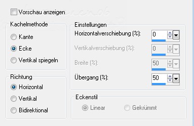 7. bleib auf der Ebene - öffne und kopiere die Datei "Calguisdecor81210" als neue Ebene in deine Leinwand einfügen Effekte - Bildeffekte - Nachtloses Kacheln - wie eingestellt stelle den Mischmodus der Ebene auf weiches Licht 8. öffne und kopiere die Datei "Nathdesign-latte-macchiato-10" als neue Ebene einfügen Anordnen - an 1. Stelle verschieben - Effekt - Bildeffekt - Verschiebung/Versatz