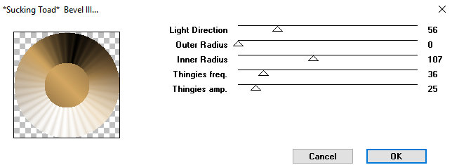 *1* Öffne eine neue transparente Leinwand 750 x 750 px Fülle die Leinwand mit dem Fülleimer (F) mit dem Farbverlauf (linke Maustaste) *2* Effekte - Plugin - Toadies - Sucking Toad Bevel III Werte siehe Screen