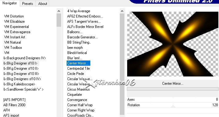 Weitere Tutorials und Tuben findest du hier ![]() Du benötigst dein PSP eine schöne Tube 1 abstraktes HG Bild (oder das aus dem Material) Das Material aus der Schatzkiste ![]() Entpacke das Material an einem Ort deiner Wahl Das Preset speichere im Ordner Voreinstellungen deines PSP, falls du den Emboss 3 noch nicht hast PLUGINS: I.C.Net Software - FU2 - &<Bkg sf10 I - Center Mirror Redfield --> ![]() Simple - Top Left Mirror Dies sind die Original Farben: