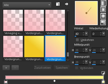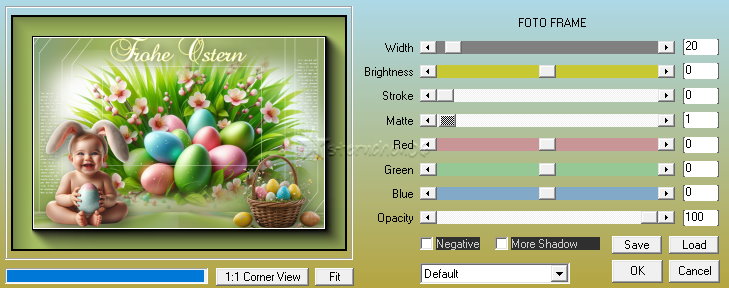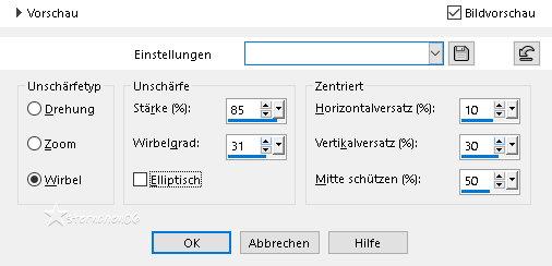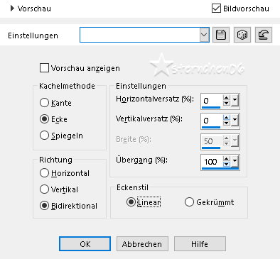 Achtung Änderungen in PSP 2020 beim Mischmodus ![]() ![]() Das Copyright des ins deutsche übersetzten Tutorials liegt bei mir sternchen06/A.Brede-Lotz Das Tutorial darf nicht kopiert, auf anderen Seiten zum Download angeboten werden Das Original Tutorial ist von Sylviane und du findest es hier ![]() ![]() Weitere Tutorials und Tuben findest du hier ![]() ![]() Du benötigst dein PSP 1 Haupttube 1 misted Hintergrundbild ( 900x498) 1 Dekotube Das Material aus der Kiste ![]() Entpacke das Material an einem Ort deiner Wahl Die hier benutzte Font Baroque Script kannst du hier runterladen PLUGINS: MuRa's Meister - Perspective Tiling AAA Frames - Foto Frame ORIGINAL FARBEN: ![]() Farbverlauf - Linear ![]() ![]() *1* Öffne eine neue transparente Leinwand 900 x 600 px fülle die Leinwand mit dem Farbverlauf Neue Rasterebene *2* Auswahl - Alle auswählen Öffne dein misted HG Bild - Credit entfernen falls vorhanden Bearbeiten - Kopieren zurück zu deiner Leinwand Bearbeiten - In eine Auswahl einfügen Auswahl aufheben *3* Evtl. Horizontal spiegeln (Bildabhängig) *4* Effekte - Bildeffekte - Nahtloses Kacheln ![]() *5* Einstellen - Unschärfe - Strahlenförmige Unschärfe ![]() *6* Einstellen - Unschärfe - Gaußsche Unschärfe - Radius: 50 *7* Ebene duplizieren *8* Bild - Spiegeln - Horizontal spiegeln *9* Ebenen - Zusammenführen - Nach unten zusammenfassen *10* Wiederhole Nach unten zusammenfassen *11* Ebene duplizieren *12* Effekte - Plugins - MuRa's Meister - Perspective Tiling ![]() *13* Effekte - 3D Effekte - Schlagschatten ![]() *14* Öffne deinen misted HG (evtl. Credit entfernen) Bearbeiten - Kopieren zurück zu deiner Leinwand Bearbeiten - Als neue Ebene einfügen *15* Aktiviere das auswahlwerkzeug (S) - Benutzerdefinierte Auswahl ![]() Der Wert 530 passte nicht *16* Neue Rasterebene *17* Mit weiß füllen *18* Auswahl - Ändern - Verkleinern - 1 px *19* Drücke die Entfernen Taste *20* Ebene duplizieren *21* Drücke Taste K Drücke Taste M *22* Ebenen - Zusammenführen - Nach unten zusammenfassen *23* Effekte - Reflexionseffekte - Spiegelrotation ![]() *24* Ebene duplizieren *25* Bild - Spiegeln - Vertikal spiegeln *26* Bild - Spiegeln - Horizontal spiegeln *27* Objekte - Ausrichten - Oben ![]() *28* Ebenen - Zusammenführen - Nach unten zusammenfassen *29* Öffne und kopiere "@ildiko_create_text_017" Als neue Ebene in deine Leinwand einfügen Bild - Größe ändern - kein Haken bei Größe aller Ebenen anpassen auf 95% verkleinern Drücke Taste K *30* Ebene duplizieren *31* Bild - Spiegeln - Horizontal spiegeln Drücke Taste K Drücke Taste M *32* Ebenen - Zusammenführen - Nach unten zusammenfassen *33* Neue Rasterebene *34* Aktiviere das auswahlwerkzeug (S) - Benutzerdefinierte Auswahl ![]() *35* Fülle die Auswahl mit weiß *36* Auswahl - Ändern - Verkleinern - 1 px *37* Drücke die Entfernen Taste *38* Auswahl aufheben *39* Öffne deine Haupttube - Credit entfernen Bearbeiten - Kopieren Als neue Ebene in deine Leinwand einfügen passe die Größe der Tube an - orientiere dich an meinem Bild Setze die Tube nach links unten - siehe mein Bild *40* Effekte - 3D Effekte - Schlagschatten ![]() *41* Öffne deine Dekotube - Credit entfernen als neue Ebene in deine Leinwand einfügen *42* Bild - Größe ändern im Original auf 40% *43* Setze es nach rechts unten *44* Effekte - 3D Effekte - Schlagschatten ![]() *45* Aktiviere das Textwerkzeug - Font Baroque Skript - Größe musst du testen 26 px war mir zu klein Screibe "Frohe Ostern" In Rasterebene umwandeln und nach oben mittig setzen - siehe mein Bild *46* Effekte - 3D Effekte - Schlagschatten ![]() *47* Bild - Rand hinzufügen - symmetrisch - 1 px weiß *48* Bild - Rand hinzufügen - symmetrisch - 50 px in einer passenden Farbe aus deinem Bild *49* Markiere den Rand mit dem Zauberstab Toleranz und Randschärfe 0 *50* Effekte - Plugins - AAA Frames - Fotoframe ![]() Auswahl aufheben *51* Bild - Rand hinzufügen - symmetrisch - 1 px weiß *52* Ändere die Bildgröße für mich auf 900 px Schreibe den Credit für die Tube, BG by... und deine Signatur leserlich auf dein Bild Alles zusammenfassen und als jpg/png speichern ![]() Tutorialübersetzung by sternchen06 #März 2026 |