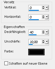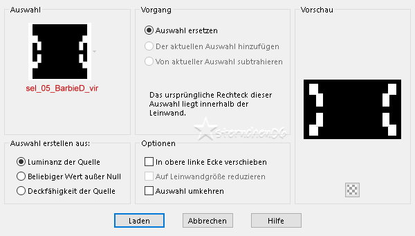 ![]() *18* Aktiviere im EM Raster 1 ![]() Auswahl - Auswahl laden/speichern - Auswahl aus Datei..... ![]() LADEN Auswahl - Ändern - Verkleinern - 10 px Effekte - Plugins - penta.com - jeans ![]() Auswahl aufheben Effekte - Plugins - Alien Skin - Eye Candy 5: Impact - Perspective Shadow Settings: Drop Shadow,Blurry Basic: ![]() *19* Aktiviere im EM die oberste Ebene (Raster 3) Öffne und kopiere "deco_02_BarbieD_vir" als neue Ebene in deine Leinwand einfügen Mischmodus: Luminanz (Vorversion) Effekte - 3D Effekte - Schlagschatten 0 - 0 - 50 - 30 - schwarz *20* Öffne und kopiere "deco_03_BarbieD_vir" als neue Ebene in deine Leinwand einfügen Objekte - Ausrichten - Links oder K Position X: 0 - Position Y: 120 *21* Effekte - Textureffekte - Flechten ![]() Effekte - Plugins - Alien Skin - Eye Candy 5: Impact - Perspective Shadow - OK *22* Verschiebe diese Ebene unter Umgewandelte Auswahl - siehe Screen ![]() Mischmodus: Luminanz Ergebnis: ![]() *23* Aktiviere die darüberliegende Ebene Öffne und kopiere "deco_04_BarbieD_vir" als neue Ebene in deine Leinwand einfügen Drücke Taste K Position X: 164 - Position Y: 0 Drücke Taste M Effekte - Plugins - Alien Skin - Eye Candy 5: Impact - Perspective Shadow - OK *24* Aktiviere im EM die unterste Ebene Bearbeiten - Kopieren Ebenen - Zusammenführen - Sichtbare zusammenfassen *25* Bild - Rand hinzufügen - symmetrisch 1 px - Farbe 1 8 px - weiß 1 px - Farbe 1 Auswahl - Alle auswählen *26* Bild - Rand hinzufügen - symmetrisch 40 px - weiß Auswahl umkehren Bearbeiten - In eine Auswahl einfügen *27* Effekte - Plugins - Simple - Diamonds oder über den FU2 ![]() Einstellen - Unschärfe - Gaußsche Unschärfe - Radius: 25 Effekte - Verzerrungseffekte - Pixeltransformation ![]() Einstellen - Schärfe - Scharfzeichnen Auswahl umkehren Effekte - 3D Effekte - Schlagschatten 0 - 0 - 60 - 30 - schwarz Auswahl aufheben *28* Bild - Rand hinzufügen - symmetrisch 10 px - weiß 2 px - Farbe 1 Effekte - Plugins - AAA Frames - Foto Frame ![]() *29* Öffne und kopiere "deco_05_BarbieD_vir" als neue Ebene in deine Leinwand einfügen Mischmodus: Überzug *30* Öffne und kopiere "texte_BarbieD_vir" als neue Ebene in deine Leinwand einfügen Drücke Taste K Position X: 87 - Position Y: 256 Drücke Taste M Effekte - 3D Effekte - Schlagschatten - Farbe 5 ![]() *31* Öffne deine Hauptttube - Credit entfernen Bearbeiten - Kopieren als neue Ebene in deine Leinwand einfügen Größe der Tube anpassen - orientiere dich an meinem Bild Drücke Taste K Position X: 551 - Position Y: 8 Drücke Taste M Effekte - Plugins - Alien Skin - Eye Candy 5: Impact - Perspective Shadow - OK *32* Alles zusammenfassen Ändere die Bildgröße für mich auf 900 px schreibe den Credit für die Tube und deine Signatur auf das Bild Alles zusammenfassen Einstellen - Schärfe - Unscharf maskieren ![]() ![]() Tutorialübersetzung by sternchen06 #Februar 2026 |