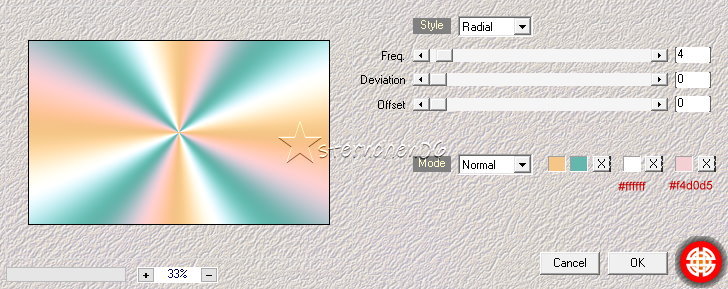 Achtung Änderungen in PSP 2020 beim Mischmodus ![]() ![]() Das Copyright des ins deutsche PSP übersetzten Tutorials liegt bei mir sternchen06 aka A.Brede-Lotz. Das Tutorial darf nicht kopiert oder auf anderen Seiten zum Download angeboten werden. Herzlichen Dank liebe Virginia das ich deine Tutoriale ins Deutsche übersetzen darf Merci aimez beaucoup Virginia je peux traduire vos tutoriels en allemand Das Originaltutorial findest du hier ![]() ![]() Weitere Tutorials und Tuben findest du hier ![]() ![]() Du benötigst: Dein PSP 1 Haupttube meine ist von Virginia Das Material aus der Kiste ![]() Entpacke das Material an einem Ort deiner Wahl Die Sel Datei verknüpfe mit deinem PSP PLUGINS: I.C.Net Software - FU2 Filter Factory Gallery F Texturize Simple AAA Frames - Foto Frame Alien Skin - Eye Candy 5: Impact Carolaine and Sensibility Graphics Plus - Quick Tile I und II *oder über den FU aufrufen Mehdi - Wavy Lab 1.1 penta.com - jeans Richard Rosenman Original Farben: ![]() Meine Farben: ![]() VG/HG ![]() ![]() *1* Öffne eine neue transparente Leinwand 900 x 550 px Auswahl - Auswahl laden/speichern - Auswahl aus Datei... ![]() LADEN Fülle die Auswahl mit der VG Farbe Auswahl aufheben *2* Auswahl - Auswahl laden/speichern - Auswahl aus Datei... ![]() LADEN Fülle die Auswahl mit der HG Farbe Auswahl aufheben *3* Effekte - Plugins - Graphics Plus - Quick Tile I ![]() *4* Neue Rasterebene Effekte - Plugins - Mehdi - Wavy Lab 1.1 - 2-1-3-4 ![]() Ebenen - Anordnen - Nach unten verschieben *5* Bleibe auf Rasterebene 2 (Hintergrundebene) Einstellen - Unschärfe - Gaußsche Unschärfe - Radius: 25 Effekte - Plugins - Graphics Plus - Quick Tile II ![]() *6* Ebene duplizieren Bild - Größe ändern - auf 80% verkleinern (kein Haken bei Größe aller Ebenen anpassen) Effekte - Pluginns - I.C.Net Software - FU2 - Filter Factory Gallery F - Sector Mosaic ![]() Einstellen - Schärfe - Stark scharfzeichnen Ergebnis: ![]() *7* Bleib auf der Ebene ![]() Effekte - Plugins - Carolaine and Sensibility - cs_texture ![]() Effekte - Reflexionseffekte - Spiegelrotation ![]() *8* Ebene duplizieren Bild - Größe ändern - auf 80% verkleinern (kein Haken bei Größe aller Ebenen anpassen) Bild - Frei drehen ![]() *9* Bleib auf der Ebene ![]() Bild - Größe ändern - auf 77% verkleinern (kein Haken bei Größe aller Ebenen anpassen) Effekte - Plugins - Carolaine and Sensibility - cs_texture - OK Effekte - Reflexionseffekte - Spiegelrotation - OK Einstellen - Schärfe - Scharfzeichnen Ergebnis: ![]() *10* Bleib auf der Ebene Effekte - Bildeffekte - Nahtloses Kacheln - Standard ![]() *11* Auswahl - Auswahl laden/speichern - Auswahl aus Datei..... ![]() LADEN Drücke die Entfernen Taste Auswahl beibehalten *12* Aktiviere im EM die darunterliegende Ebene Auswahl in Ebene umwandeln Ebenen - Anordnen - An 1. Stelle verschieben Auswahl beibehalten *13* Effekte - Plugins - Alien Skin - Eye Candy 5:Impact - Glass Settings: Clear Basic: ![]() Auswahl aufheben *14* Öffne und kopiere "deco_01_BarbieD_vir" als neue Ebene in deine Leinwand einfügen Mischmodus: Luminanz (Vorversion) oder einfärben Effekte - 3D Effekte - Schlagschatten ![]() *15* Aktiviere im EM die 2. Ebene von unten ![]() Auswahl - Alle auswählen Auswahl - Schwebend Auswahl - Nicht schwebend Effekte - Plugins - Richard Rosenman - Solid Border - v1.1 ![]() Effekte - 3D Effekte - Schlagschatten 0 - 0 - 50 - 30 - schwarz Auswahl aufheben Mischmodus: Hartes Licht *16* Aktiviere im EM die Ebene darüber ![]() Effekte - 3D Effekte - Schlagschatten 0 - 0 - 40 - 30 - schwarz *17* Aktiviere im EM die unterste Ebene (Raster 2) Auswahl - Auswahl laden/speichern - Auswahl aus Datei..... ![]() LADEN Effekte - Plugins - I.C.Net Software - FU2 - Texturize - Wood 2 ![]() Auswahl aufheben Ergebnis:
