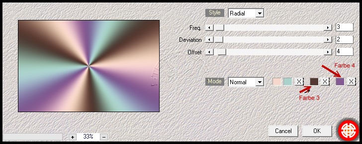 Achtung Änderungen in PSP 2020 beim Mischmodus ![]() Das Copyright des ins deutsche PSP übersetzten Tutorials liegt bei mir sternchen06/A.Brede-Lotz Das Tutorial darf nicht kopiert oder auf anderen Seiten zum Download angeboten werden. Das Original Tutorial ist von Marydu findest es hier ![]() Bilder zu den Tutorials findest du hier Du benötigst dein PSP 1 copysafe Tube meine ist eine von mir generierte AI und das Material aus der Box ![]() Entpacke das Material an einem Ort deiner Wahl Die Filter importiere in den FU2 falls du sie noch nicht hast FILTER: Grün geschriebene Filter sind im FU2 Mehdi - Wavy Lab 1.1 VM 1 - Web Weaver Bkg Designer 10. I. - Corner Half Wrap Bkg Designer. 10 . IV. - Grid VanDerLee - UnPlugged -X - Interlace Graphics Plus - Gross Shadow FARBEN: ![]() Erstelle deine eigene Farbpalette wenn du andere Farben verwendest oder Färbe mit dem Filter Nik Color ein VG/HG ![]() *1* Öffne eine neue transparente Leinwand 850 x 550 px Effekte - Plugins - Mehdi - Wavy Lab 1.1 ![]() Ebene duplizieren *2* Effekte - Plugins - I.C.Net Software - FU2 - VM 1 - Web Weaver ![]() Ebene duplizieren *3* Effekte - Plugins - I.C.Net Software - FU2 - Bkg Designer 10. I. - Corner Half Wrap ![]() Einstellen - Schärfe - Stark scharfzeichnen *4* Effekte - Plugins - I.C.Net Software - FU2 - Bkg Designer. 10 . IV. - Grid ![]() Deckkraft der Ebene zwischen 50 und 60 Effekte - 3D Effekte - Schlagschatten 0 - 1 - 40 - 0 - schwarz *5* Stelle dich im EM auf die Ebene Kopie von Raster 1 *6* Öffne und kopiere "1777pngmaryts2023" als neue Ebene in deine Leinwand einfügen Deckkraft der Ebene: 80% Ebene duplizieren Bild spiegeln - Horizontal spiegeln *7* Im EM stelle die auf Kopie 2 von Raster 1 Öffne und kopiere "Szöveg-maryts-2023" als neue Ebene in deine Leinwand einfügen *8* Oberste Ebene ist aktiv Ebenen -- Neue Rasterebene VG/HG ![]() Erstelle diesen strahlenfrmigen Farbverlauf ![]() Auswahl - Alle auswählen Auswahl - Ändern - Verkleinern - 20 px Bearbeiten - löschen Auswahl - Ändern - Verkleinern - 10 px Bearbeiten - löschen Auswahl aufheben *9* Fülle die Auswahl mit dem Farbverlauf Auswahl - Ändern - Verkleinern - 6 px Bearbeiten - löschen Ergebnis: ![]() Auswahl aufheben *10* Effekte - Plugins - VanDerLee - UnPlogged X - Interlace ![]() Effekte - 3D Effekte - Schlagschatten 0 - 1 - 50 - 10 - schwarz Effekte - Plugins - Graphics Plus ![]() *11* Öffne und kopiere "mosolyogj..dekor-maryts-2023" als neue Ebene in deine Leinwand einfügen Ergebnis: ![]() Öffne und kopiere "Text1-maryts-2023" als neue Ebene in deine Leinwand einfügen nach links unten setzen Öffne und kopiere "Text2-maryts-2023" als neue Ebene in deine Leinwand einfügen nach rechts oben setzen - siehe mein fertiges Bild Zusammenfassen - Sichtbare zusammenfassen *12* Bild - Rand hinzufügen - symmetrisch 3 px - Auswahl - Alles auswählen Bild - Rand hinzufügen - symmetrisch 40 px - Farbe egal VG/HG ![]() Erstelle diesen strahlenförmigen Farbverlauf ![]() Fülle die Auswahl damit *13* Effekte - Plugins - Graphics Plus - wie eingestellt Auswahl - Umkehren Effekte - 3D Effekte - Schlagschatten 0 - 1 - 100 - 34 *14* Öffne erneut "mosolyogj..dekor-maryts-2023" als neue Ebene in deine Leinwand einfügen Drücke Taste K und ziehe es an den Knotenpunkten rechts und links an den Rand ![]() *15* Öffne deine Haupttube - entferne ein evtl. angeheftetes Copy Bearbeiten - Kopieren als neue Ebene in deine Leinwand einfügen Größe der Tube einpassen Effekte - 3D Effekte - Schlagschatten 1 - 0 - 55 - 26 - schwarz Zusammenfassen - Alle zusammenfassen *16* Ändere die Bildgröße auf 900 px schreibe den Credit für die Tube und deine Signatur Zusammenfassen - Alle zusammenfassen - als jpg speichern Tutorialübersetzung by sternchen06 #Nov.2023 |