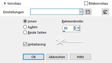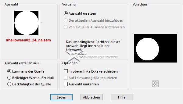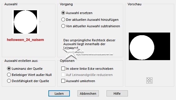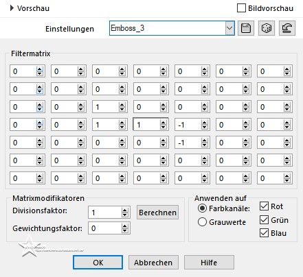 Achtung Änderungen in PSP 2020 beim Mischmodus ![]() ![]() Das Copyright des ins deutsche PSP übersetzten Tutorials liegt bei mir sternchen06/A.Brede-Lotz Das Tutorial darf nicht kopiert oder auf anderen Seiten zum Download angeboten werden. Das Original Tutorial von Naise M findest du hier:![]() ![]() Bilder zu den Tutorials findest du hier ![]() Du benötigst dein PSP 1 copysafe Vogelscheuche 1 copysafe Fledermaus den Deko Kürbis aus dem Material oder deinen eigenen 1 Dekohexe Tuben zum Tut findest du auf meiner Seite Das Material aus der Kiste ![]() Entpacke das Material an einen Ort deiner Wahl Die Seldatei verknüpfe mit deinem PSP Die Presets füge per Doppelklickdem entsprechendem Filter zu FILTER: AAA Foto Frame Alien Skin -Eye Candy5: Impact - Glass Alien Skin -Eye Candy5: Texture - Marble MuRa's Meister - Perspective Tiling FARBEN:aus dem Bild ![]() *1* Öffne "background" mit Umschalt + D erstelle eine Kopie schließe das Original *2* Ebene duplizieren *3* Effekte - Plugins - MuRa's Meister - Perspective Tiling ![]() *4* Aktiviere die untereste Ebene Auswahl - Auswahl laden/speichern - Auswahl aus Datei.... ![]() LADEN *5* Auswahl - Ändern - Auswahlrahmen auswählen ![]() *6* Neue Ebene ![]() Fülle die Ebene mit der Farbe #525252 *7* Effekte - Plugins - Alien Skin - Eye Candy 5: Impact - Glass User Settings: helloween_24 Auswahl aufheben *8* Neue Ebene Auswahl - Auswahl laden/speichern - Auswahl aus Datei... ![]() LADEN Öffne deine misted Tube (Fledermaus) - Credit entfernen Bearbeiten - Kopieren *9* Bearbeiten - In eine Auswahl einfügen ist es zu verzerrt - als neue Ebene einfügen und Größe anpassen Auswahl aufheben *10* Ebenen - Anordnen - Nach unten verschieben *11* Aktiviere die oberste Ebene Öffne und kopiere "deco_hallowen_24" als neue Ebene in deine Leinwand einfügen *12* Aktiviere die 2 Ebene von unten (Kopie von Raster 1/Hintergrund) Öffne deine Vogelscheuche - Credit entfernen Bearbeiten - Kopieren zurückzu deiner Leinwand Bearbeiten - Als neue Ebene einfügen Objekte - Ausrichten - Rechts drücke Taste K Position X: 417 - Position Y: 109 drücke M zum Abwählen *13* Aktiviere die 2 Ebene von unten (Kopie von Raster 1/Hintergrund) Öffne und kopiere "titulo" als neue Ebene in deine Leinwand einfügen Objekte - Ausrichten - Rechts drücke Taste K Position X: 606 - Position Y: -5 drücke M zum Abwählen *14* Aktiviere die oberste Ebene *15* Öffne und kopiere "tube_01_hallo_naisem" als neue Ebene in deine Leinwand einfügen drücke Taste K Position X: 347 - Position Y: 401 drücke M zum Abwählen *16* Bild - Rand hinzufügen - symmetrisch 1 px - helle Farbe aus dem Bild 3 px - dunkle Farbe aus dem Bild 1 px - helle Farbe aus dem Bild 36 px - eine mittlere Farbe aus dem Bild *17* Aktiviere den Zauberstab (Toleranz und Randschärfe 0) klicke in den breiten Rand damit Effekte - Plugins - Alien Skin - Eye Candy 5: Texture - Marble User Settings: hellow01 Basic: wähle 1 helle und 1 dunkle Farbe aus dem Bild *18* Effekte - Benutzerdefinierter Filter - Emboss 3 ![]() *19* Effekte - Plugins - AAA Frames - Foto Frame ![]() *20* Auswahl umkehren Effekte - 3D Effekte - Schlagschatten ![]() Auswahl aufheben *21* Neue Ebene fülle diese mit der Farbe: #757144 Effekte - Plugins - Alien Skin - Eye Candy 5: Texture - Marble User Settings: hellow01 Basic: wähle 1 helle und 1 dunkle Farbe aus dem Bild Mischmodus der Ebene: Überzug oder was dir besser gefällt Deckkraft der Ebene: 50 % Effekte - Benutzerdefinierter Filter - Emboss 3 ![]() *22* Setze noch eine Dekohexe in die linke untere Ecke (nicht zu groß) Alles zusammenfassen Bildgröße auf 900 px ändern Schreibe den Credit für die Tuben und deine Signatur auf das Bild alles zusammenfassen und als jpg speichern ![]() Tutorialübersetzung by sternchen06 #September2024 |